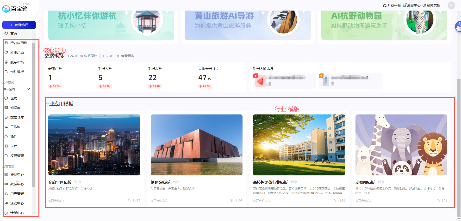 平台集成智能体(Agent)构建、数据管理、行业模板、开放生态与多渠道运营等核心能力,助力企业高效开发并落地契合实际业务需求的智能体应用,加速智能化转型升级。