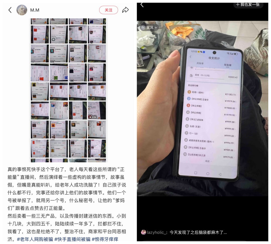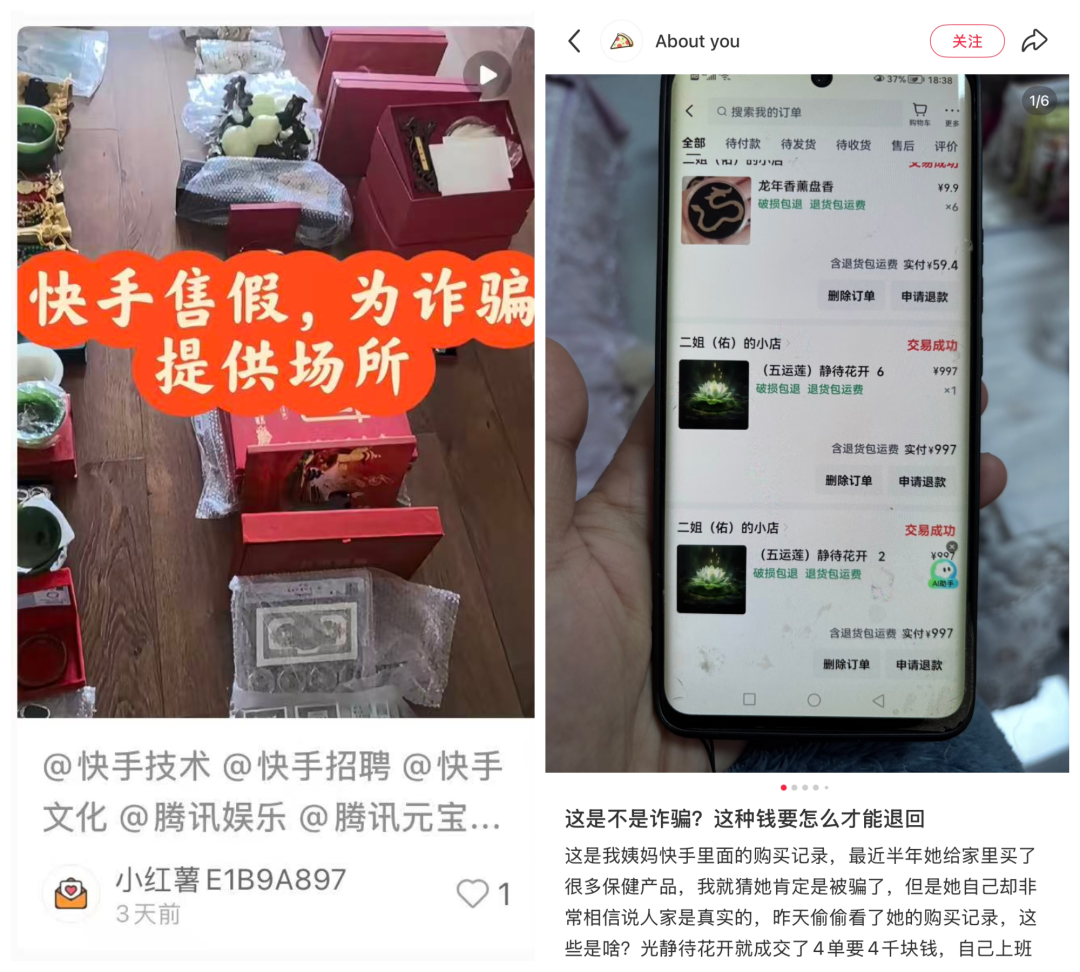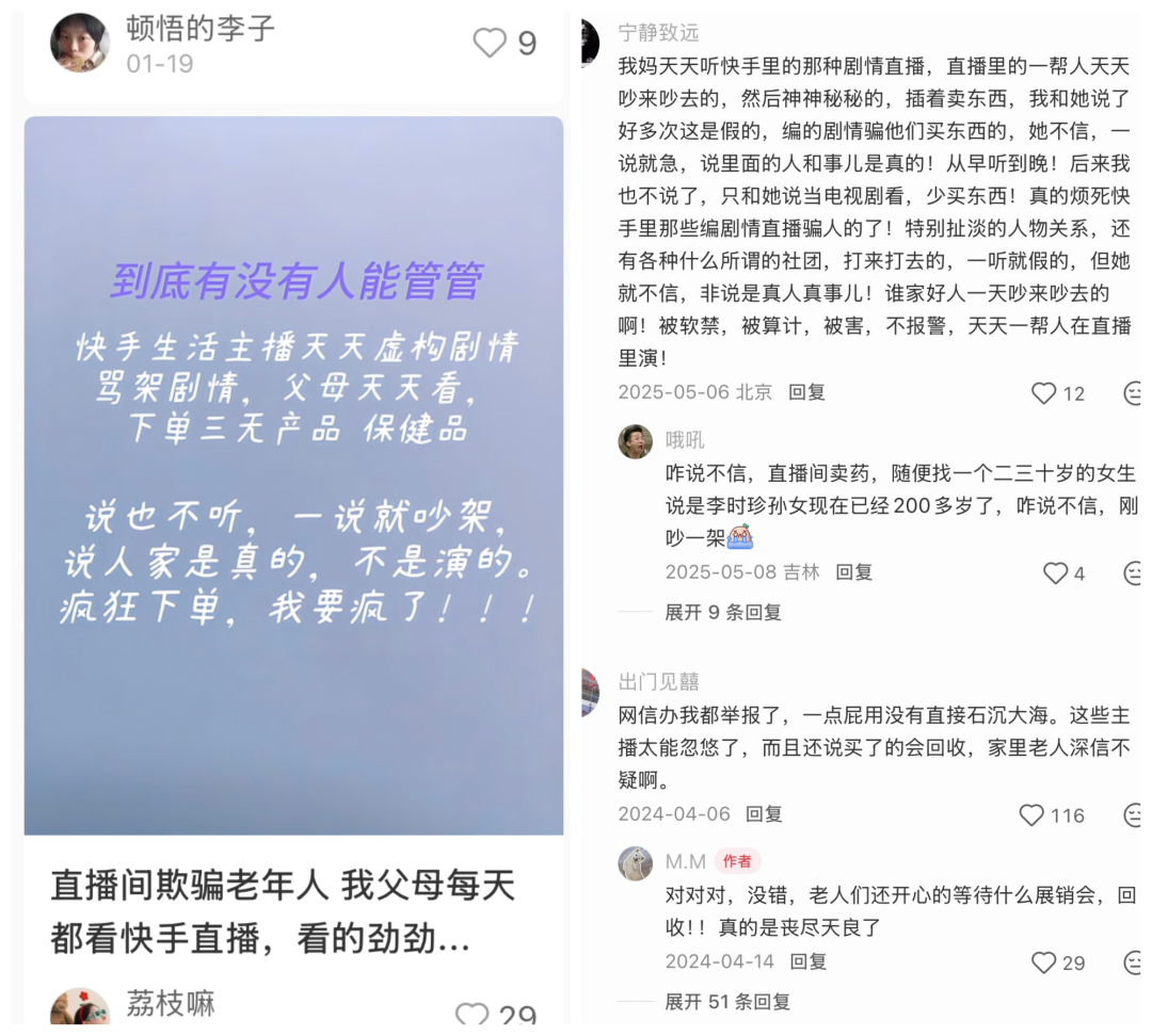 于是,一种治理上的理性选择出现了。在公域场景,如首页推荐与热门话题,快手维持着严格的审核机制,通过内容过滤规避合规风险与舆论危机。可在私域直播间,平台却表现出明显的治理惰性。对于主播利用人情话术对老年群体进行的诱导式消费,平台往往在接到明确投诉或舆论发酵后才会介入。