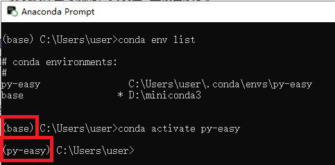 conda activate py-easy,将激活环境切换到py-easy,如下图