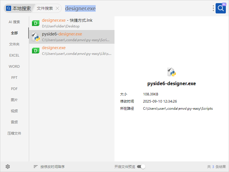 改为designer.exe后,有3个结果,一个收我自己创建的桌面快捷方式。打开designer.exe,能正常打开就行。