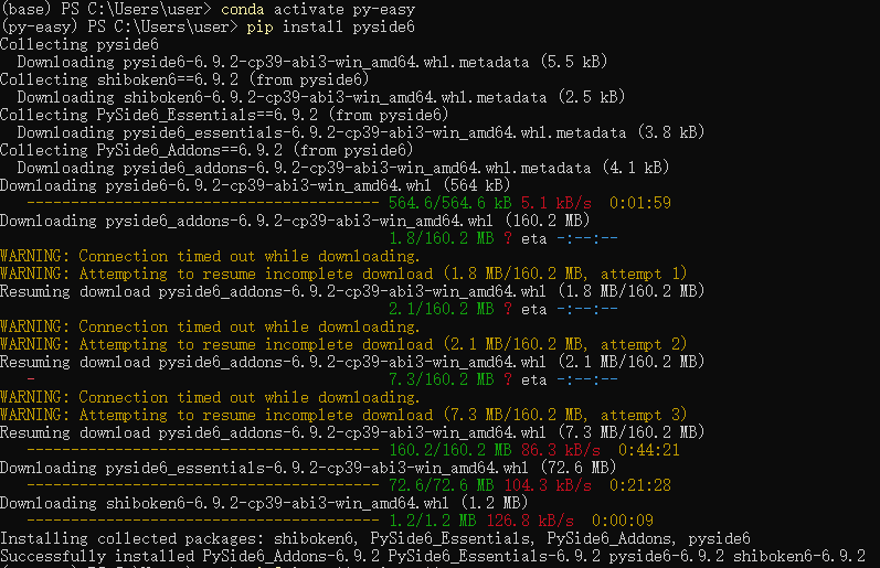 切换py-easy后,使用 pip install pyside6,安装。没用pip3,也没用清华源,不理它,干别的去了,回来也装好了。