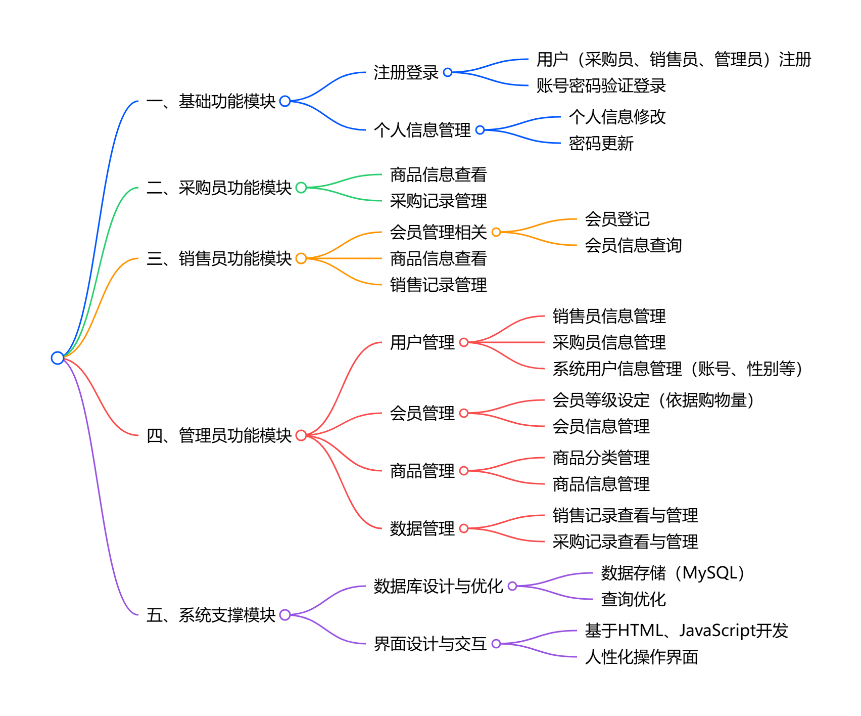- 管理员功能:管理系统用户(含销售员、采购员)信息,设定会员等级并管理会员信息,进行商品分类及商品信息管理,同时负责销售记录、采购记录的后台数据管理。