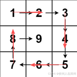 n×n的矩阵,则只要判断一下,需要多少圈可以填充完:即n/2(若n为偶数,则正好转完最后一圈;若n为奇数,则需要将最后一个值填充到最后的位置(矩阵中间的位置,也就是下一圈的起始位置),如上图中的值9)。 - 确定下一圈遍历有哪些量需要修改 :首先是起始位置