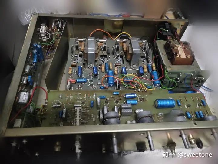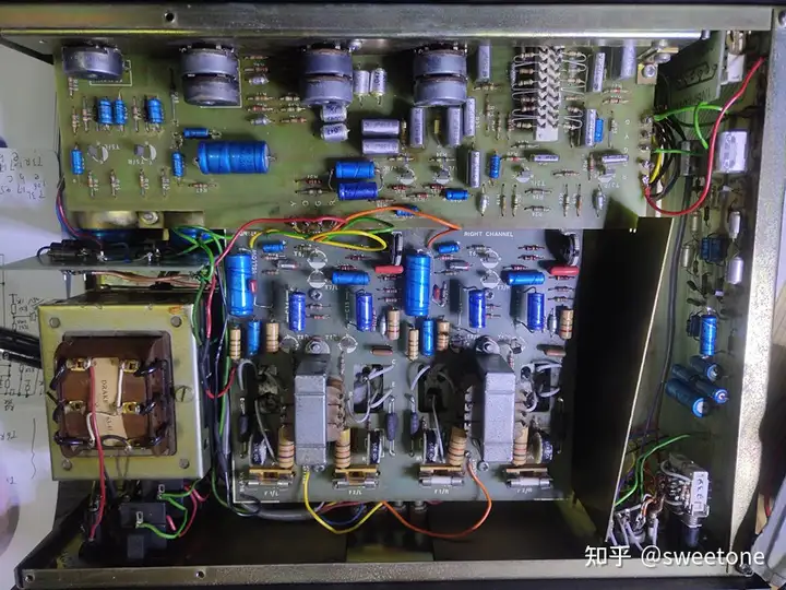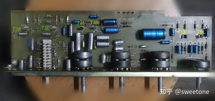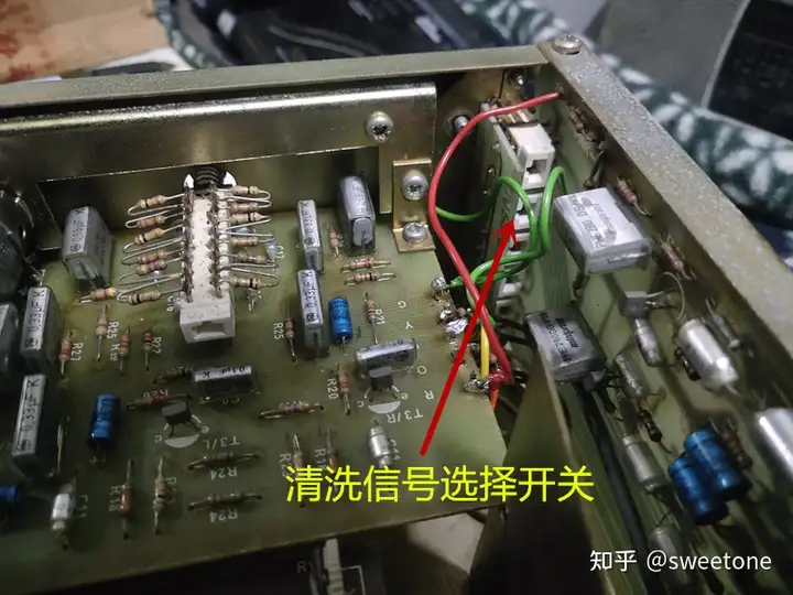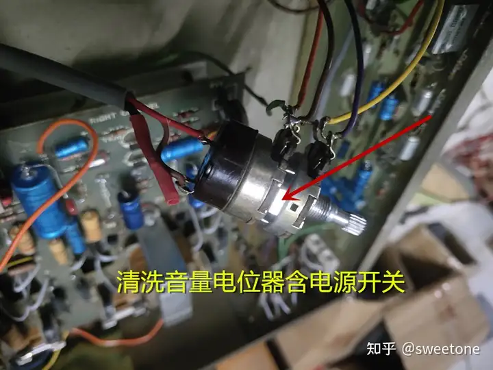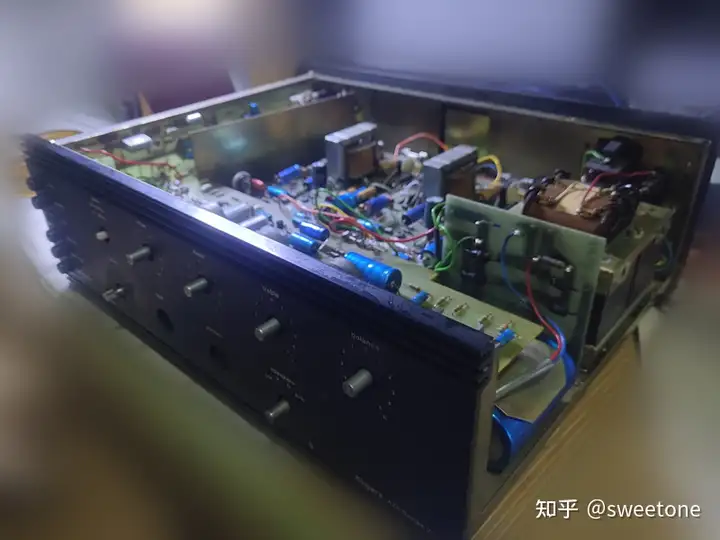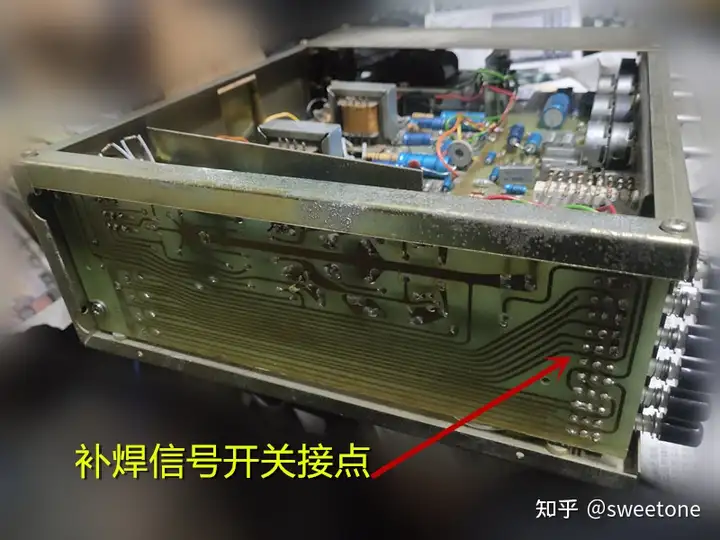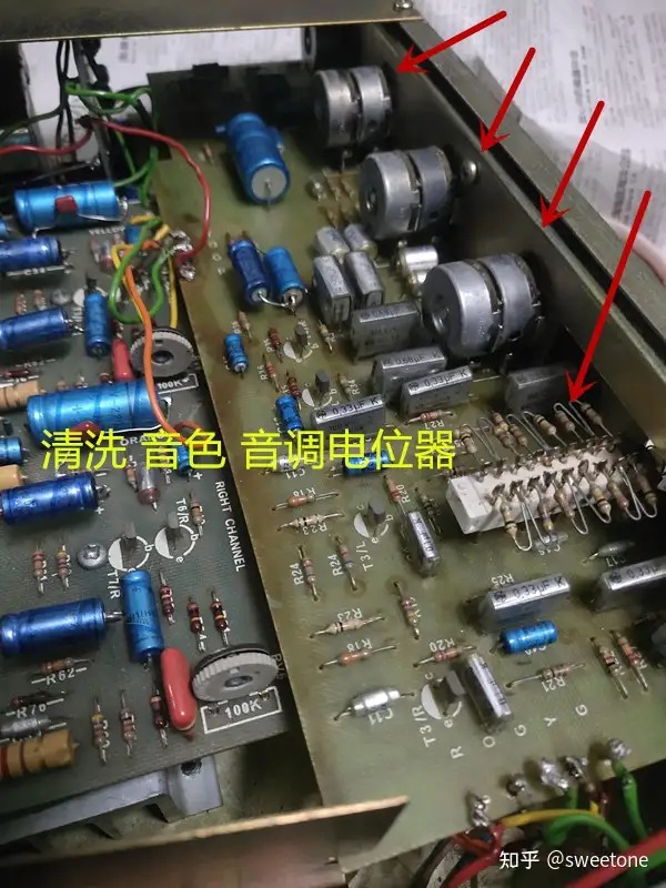 由于交流噪音暂时难以排除,那先试听音质。将音量电位器调到中等音量及以上,该声道音箱输出的声音的确有问题:声音不通透且带削波失真,的确有机主描述的声音含混不清,而且有破音的情况。将音色转换开关及音色斜率电位器,高音电位器,低音电位器,平衡电位器清洗后,该声道输出声音失真的故障仍未能排除。