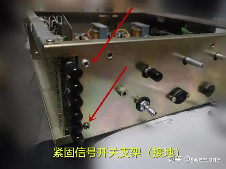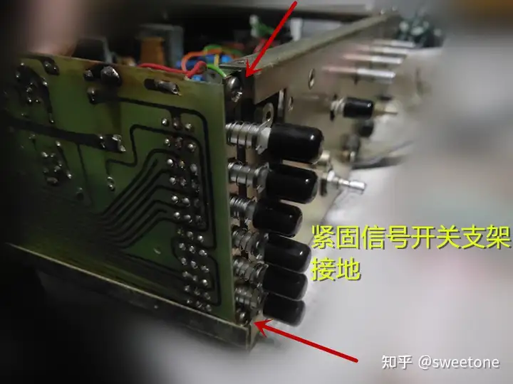 机器拿来后,首先检查该声道输出嗡嗡交流噪音偏大的问题。将音量电位器调大,该声道音箱输出的交流噪音的确比另一个声道大得多。但是,音量电位器调小后,音箱输出无交流噪音。怀疑音量电位器之前的电路引入交流噪音。用电子清洁剂清洗音量电位器,噪音降低不明显。清洗并补焊信号切换开关,噪音降低不明显。怀疑信号切换开关支架接地不良,重新紧固支架螺丝,噪音降低仍不明显。