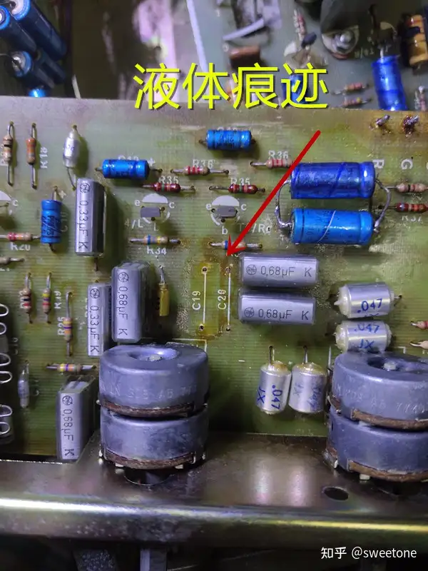 根据T4R的Ve=0.62V比T4L的Ve=0.42V要大的情况分析,T4R的Ic(接近Ie )静态电流过大。怀疑是T4R的B极0.68UF耦合电容漏电,增大了T4R的B极电流,使得T4R的Ic电流过大。拆下该耦合电容,测得基本正常。查看线路板该电容位置,发现有液体痕迹,怀疑有漏电的可能。估计液体痕迹是厂家生产线路板时残留下的化学物质,用电子清洁剂清洗掉液体痕迹,并用电吹风吹干燥。为避免0.68UF耦合电容有漏电的可能,将其换为优质的同牌子同型号RIFA电容。再通电,故障依旧。测量T4R的E,B,C电压值也不变。