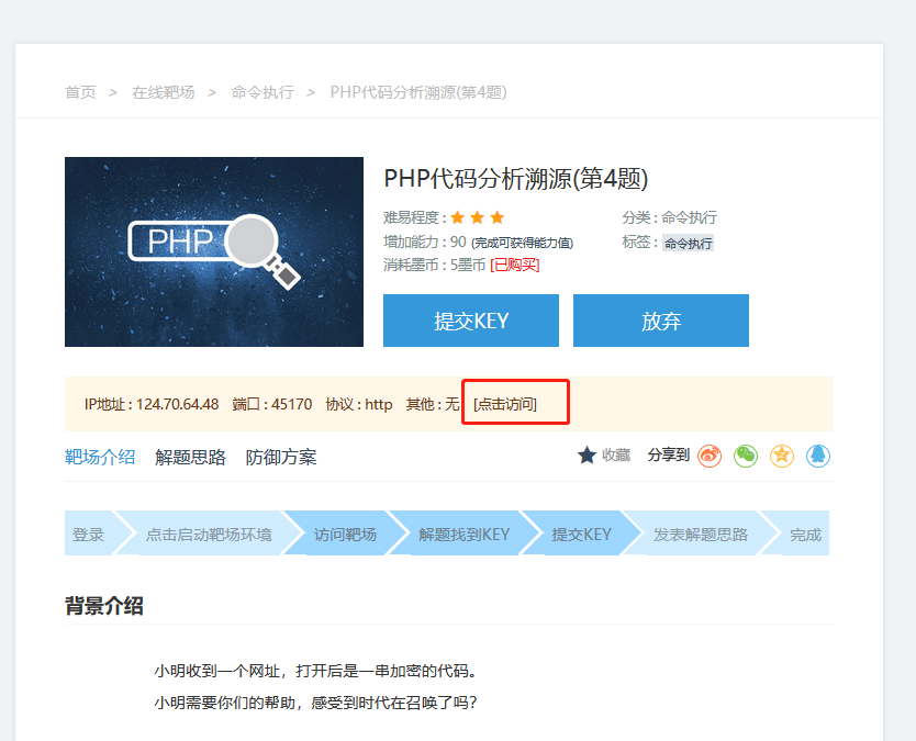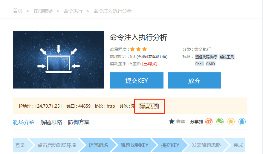 3、查看靶场信息,然后点击访问,进入漏洞页面