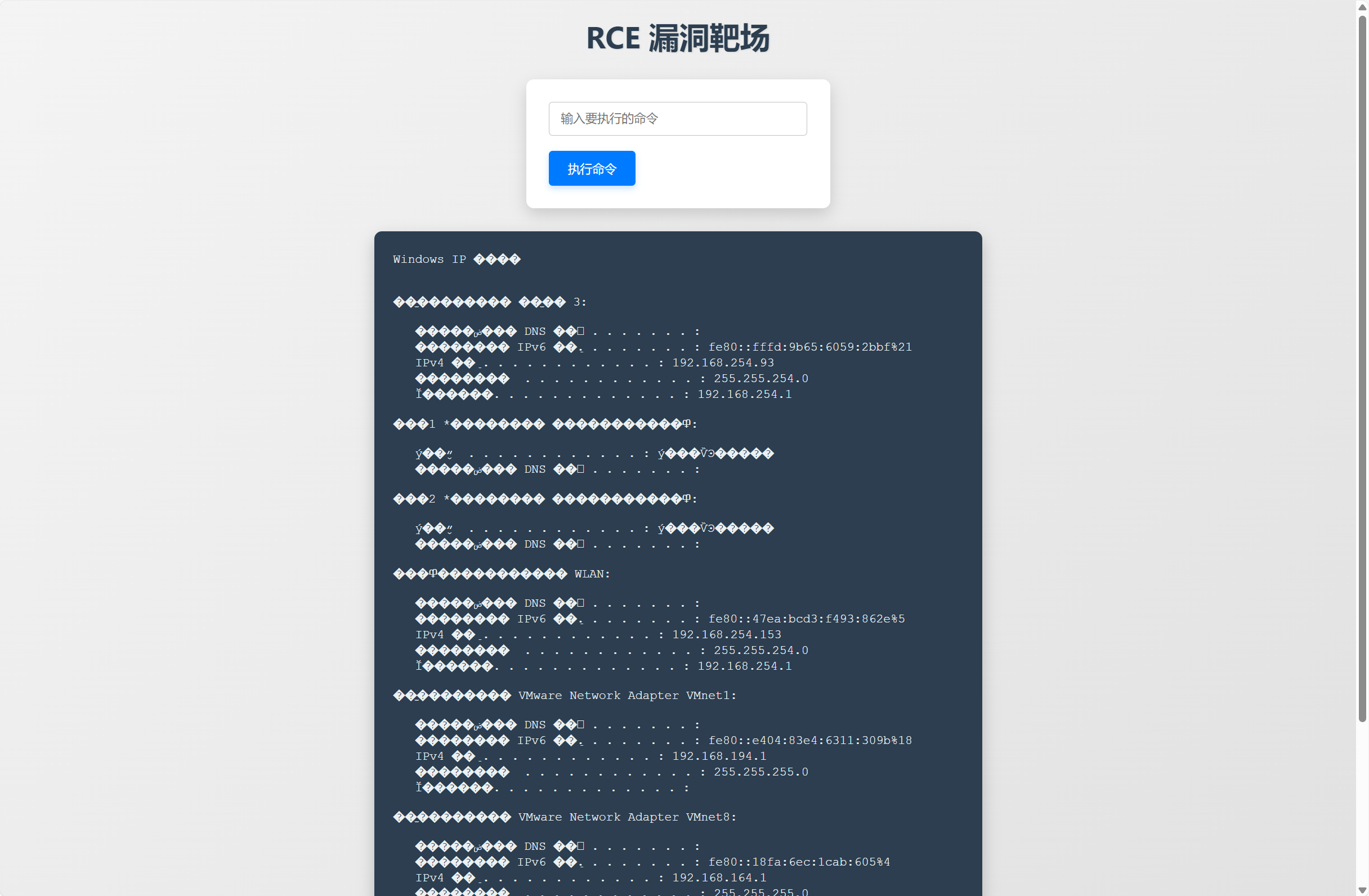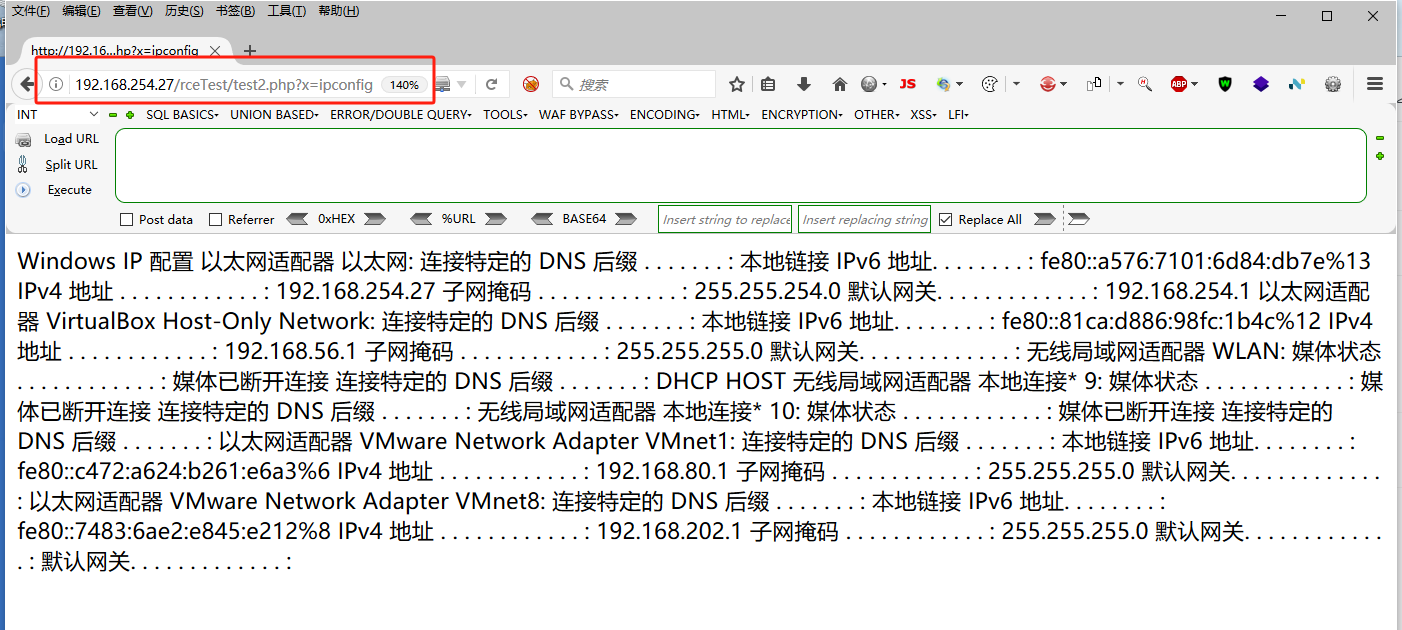 - 访问:http://ip地址:80/rceTest/rce2.php?x=ipconfig