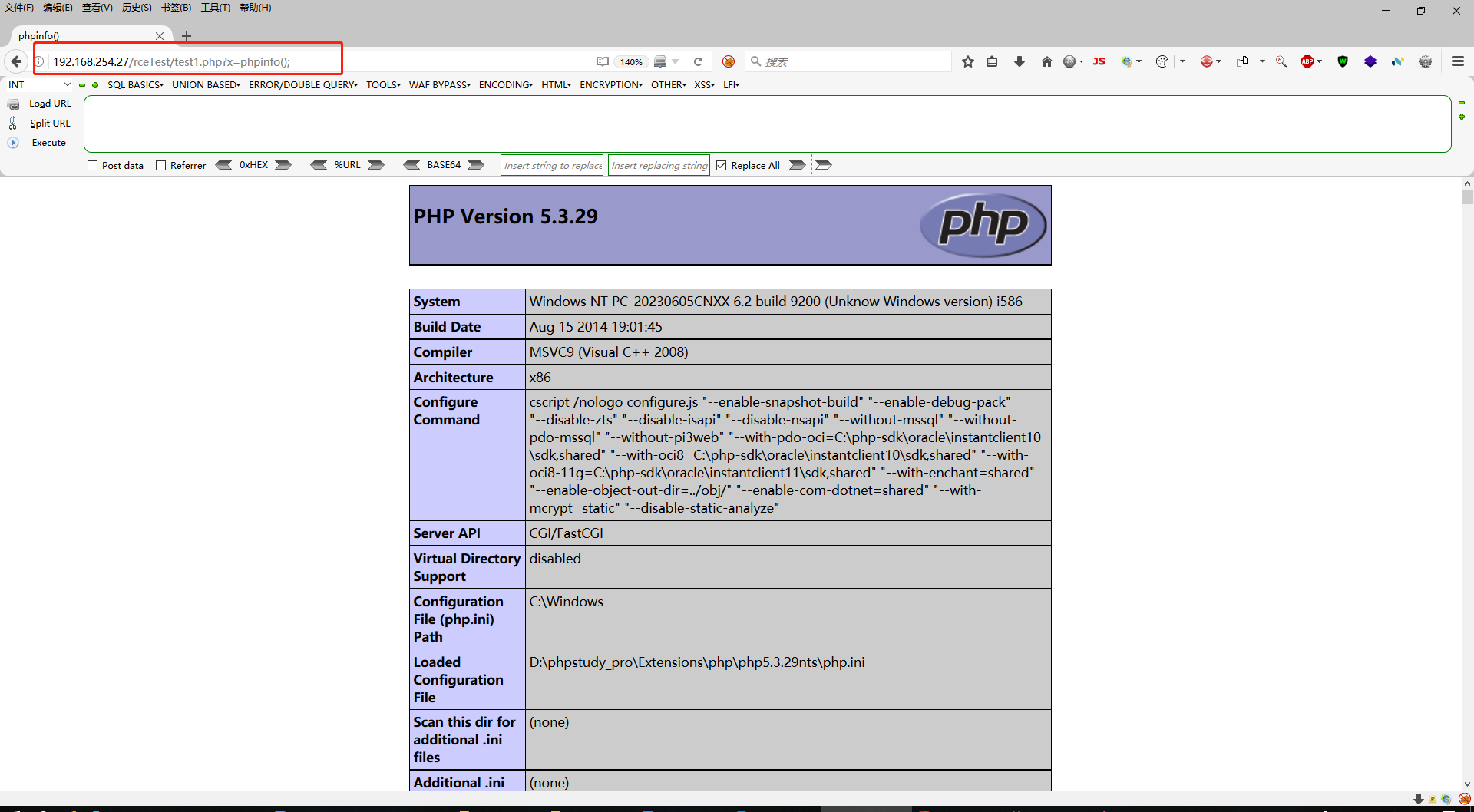 - 访问:http://ip地址/rceTest/rce1.php?x=phpinfo();