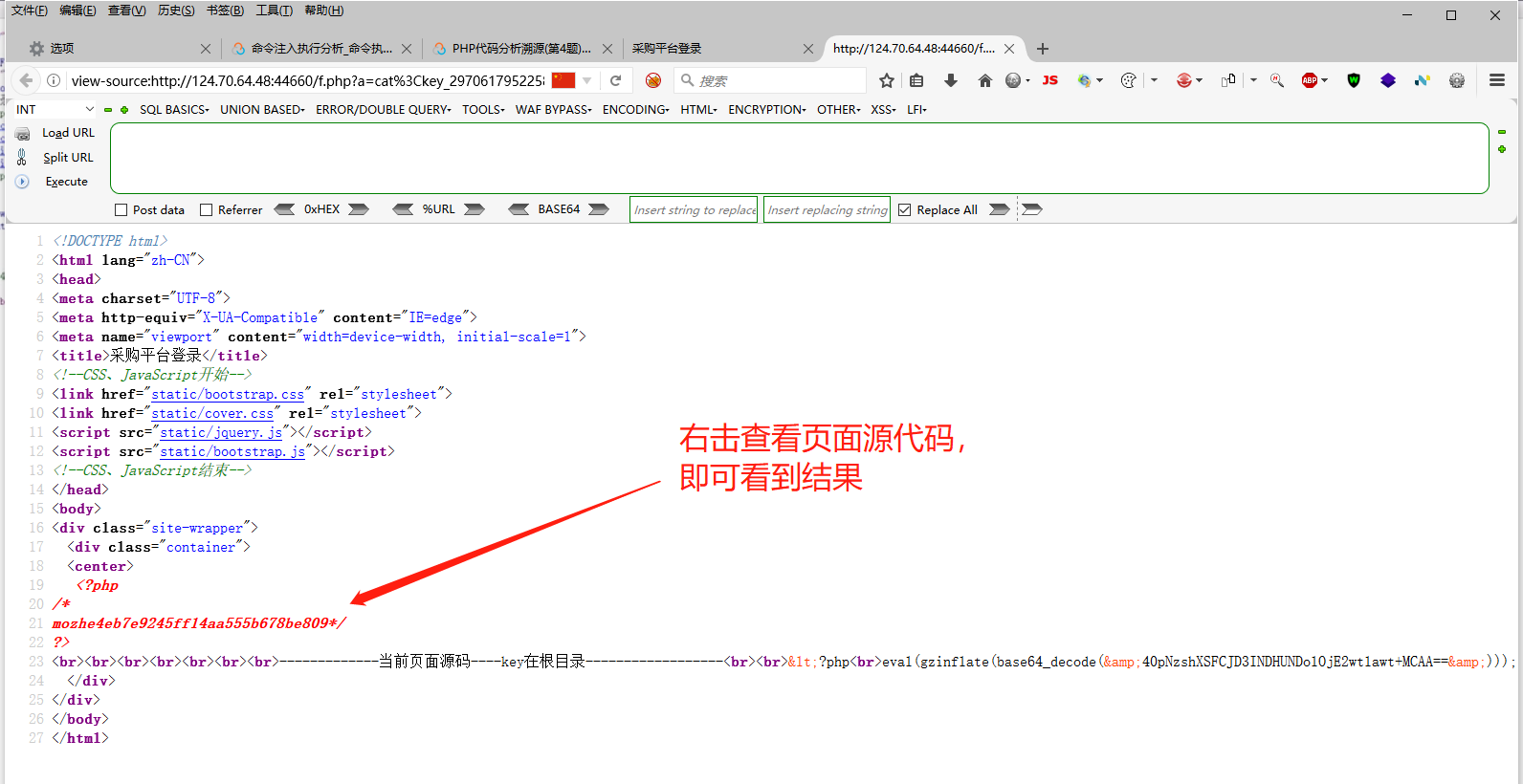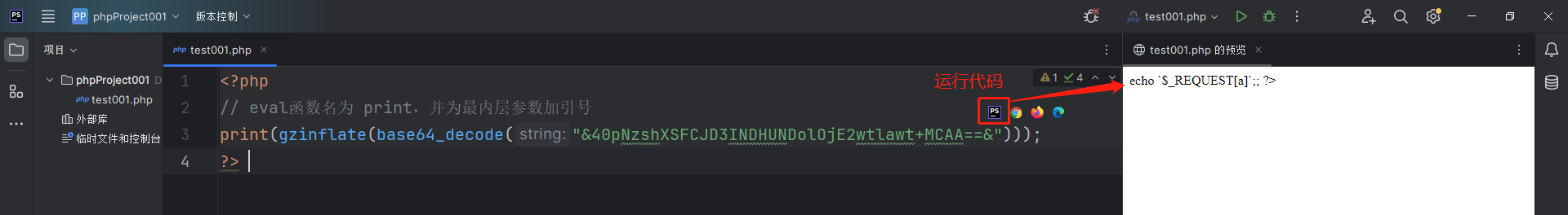 查看运行结果,发现eval() 中加密的代码是 echo $_REQUEST[a];; ?> 这串代码就是eval要执行的东西。