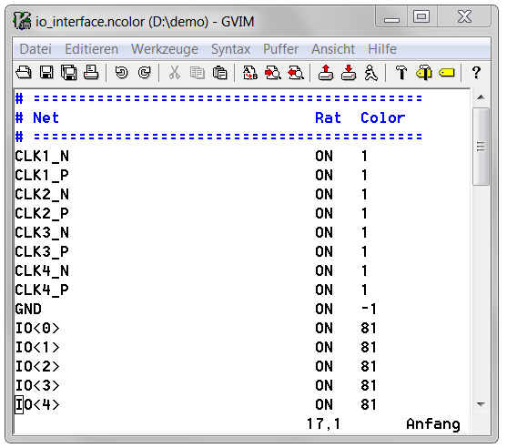 .ncolor,文件内包含三列数据,分别为网络名称 、飞线状态 和颜色编号 。其中颜色编号为-1时,表示该网络未分配颜色,这种情况常见于飞线处于显示状态,但网络未配置颜色的场景。