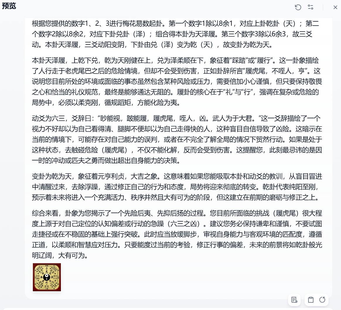 在这一环节,模型会根据用户提供的数字和背景信息进行占卜解读,最终给出深刻的分析和建议。通过配置精准的提示词,模型能够生成更符合用户需求的内容。