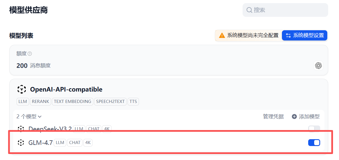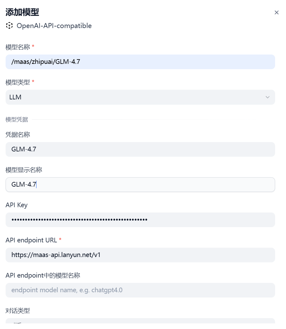 通过这些步骤,你将成功将 GLM-4.7 模型配置到 Dify 平台中,准备好进行进一步的工作流设计。
