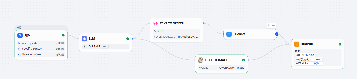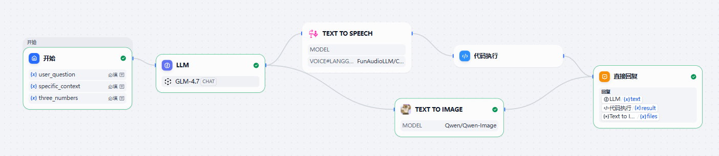 这里展示了通过 GLM-4.7 模型与 Dify 平台实现的工作流成果,包括自动化占卜解读、智能化图像生成及音频转化等多种功能集成。通过此工作流,用户可以得到更为丰富且定制化的服务体验。