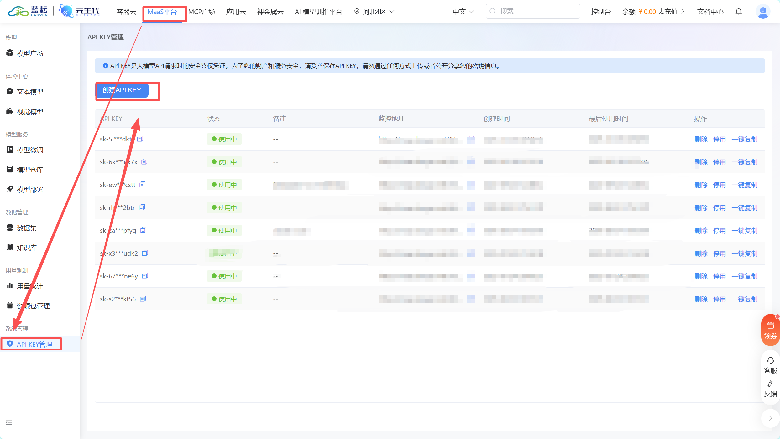- 登录 蓝耘 MaaS 平台,进入 " API Key 管理" 页面,复制您已生成的有效 API Key;