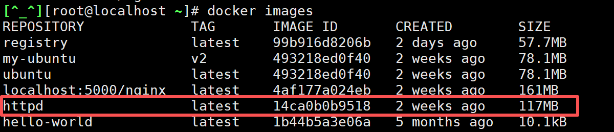 再从本地仓库拉取httpd镜像,而且拉取完镜像后,镜像ID会和已经删除的httpd镜像ID一样,并不会像从公有仓库那样,将镜像删除后,再次下载同样的镜像,镜像ID会改变。