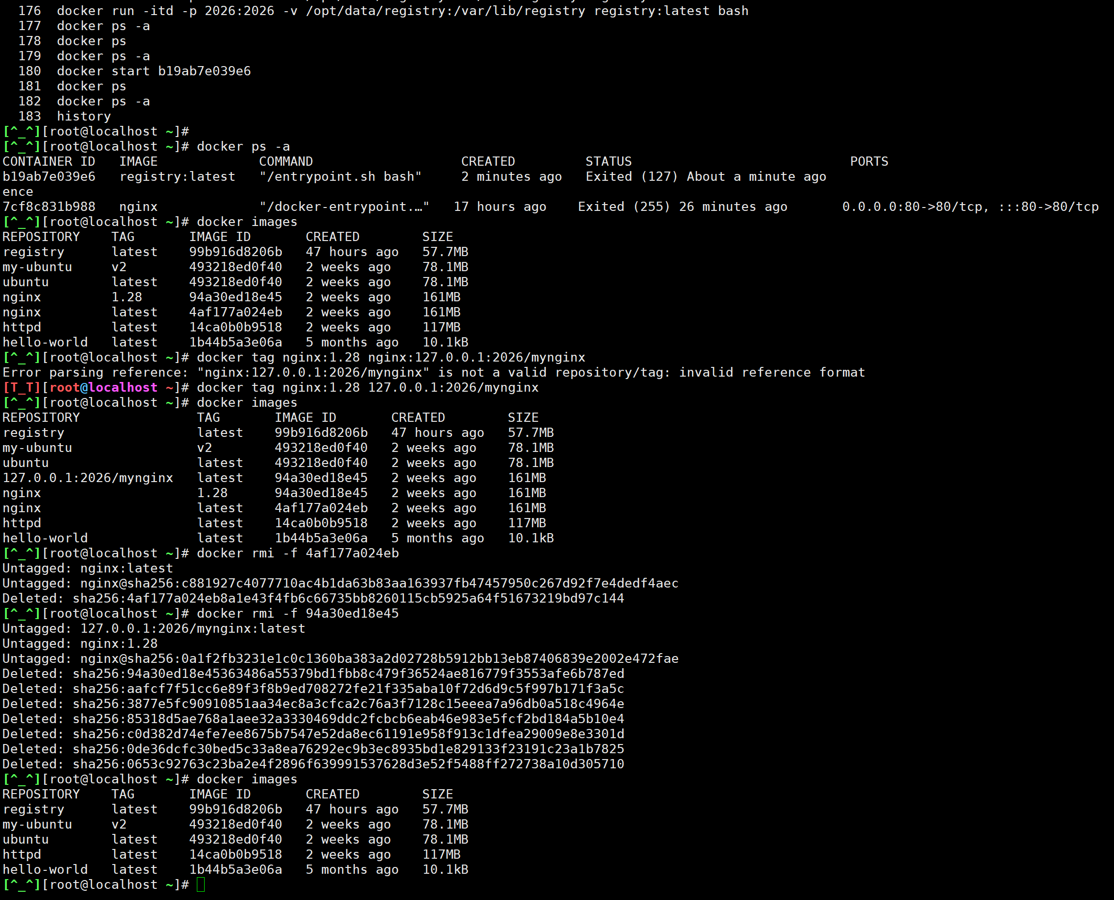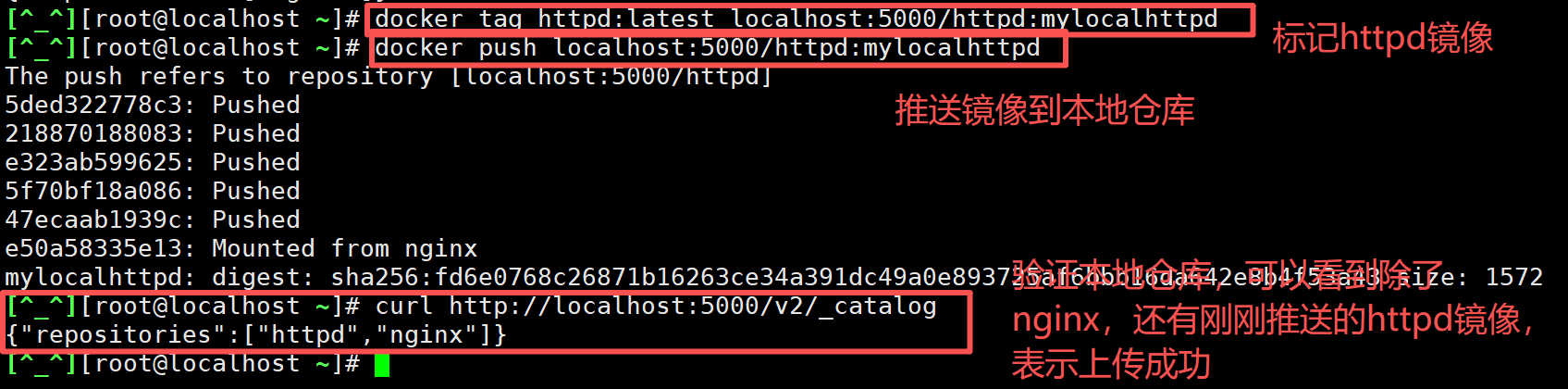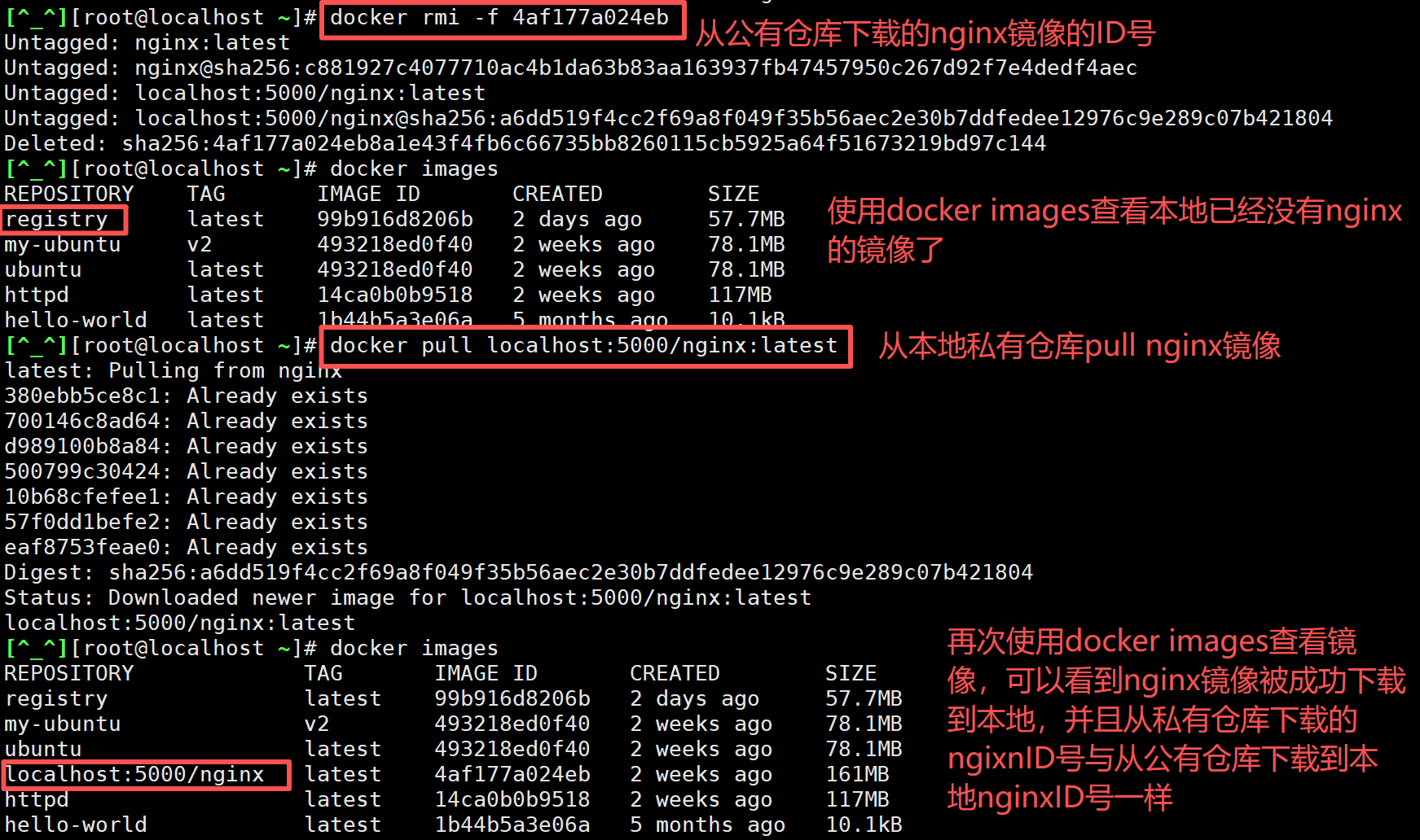 ⑤删除已有的相关镜像,并从本地仓库拉取镜像(docker rmi 与docker pull localhost:5000/镜像名:tag名)这里的tag名是标记镜像tag时候取的,参考 练习:将httpd镜像上传到registry仓库的# 标记httpd镜像那一条命令的末尾,我为httpd镜像取的Tag是mylocalhttpd