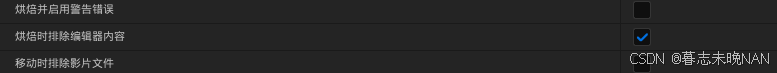 在打包的高级选项里,我们勾选烘焙时排除编辑器内容,这样可以将编辑器相关的资源排除,减少包体积。如果你发现引用了太多,你可以取消这一项选择,包体积也会相应的大一些。