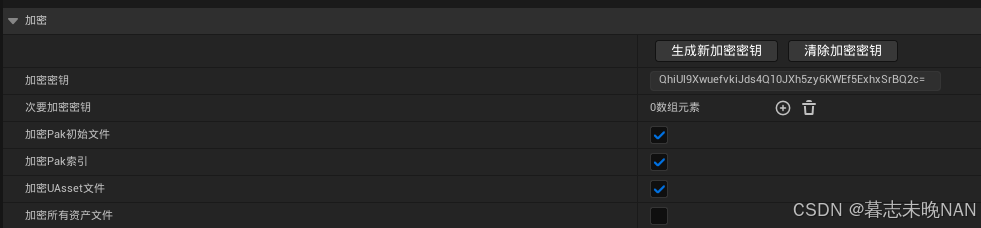 我们可以通过点击生成新加密密钥生成一个密钥,没有密钥是无法破解游戏资源的。然后将对资源加载不重要的那几项勾选。