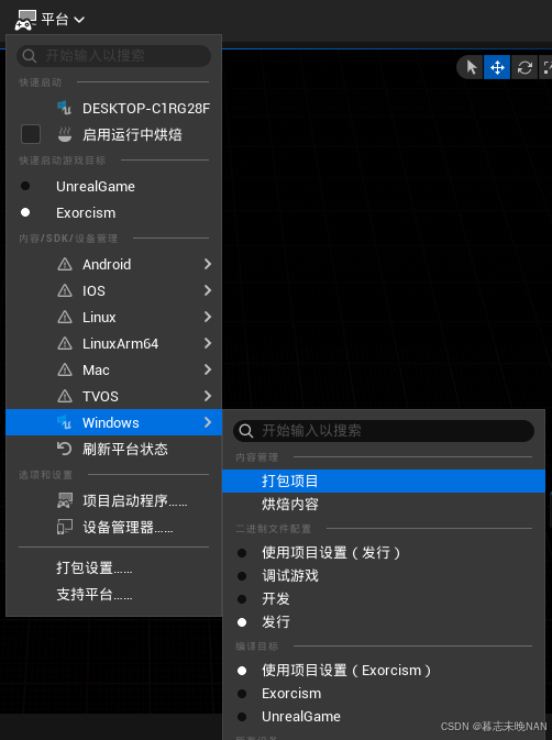 接着,在关卡选项卡下面,找到平台-Windows下面,可以打包资源包了,如果出现错误,我们就可以选择烘焙内容查看是否在烘焙资源是就出现了错误,来查询出错的地方。