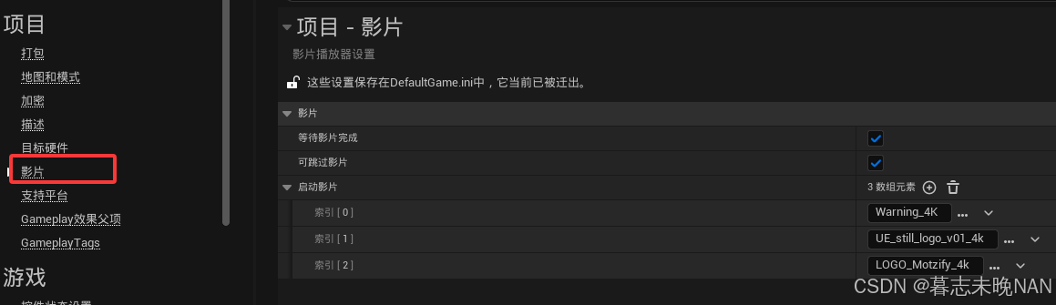 启动影片:设置播放的影片,需要放置到Content目录下的。