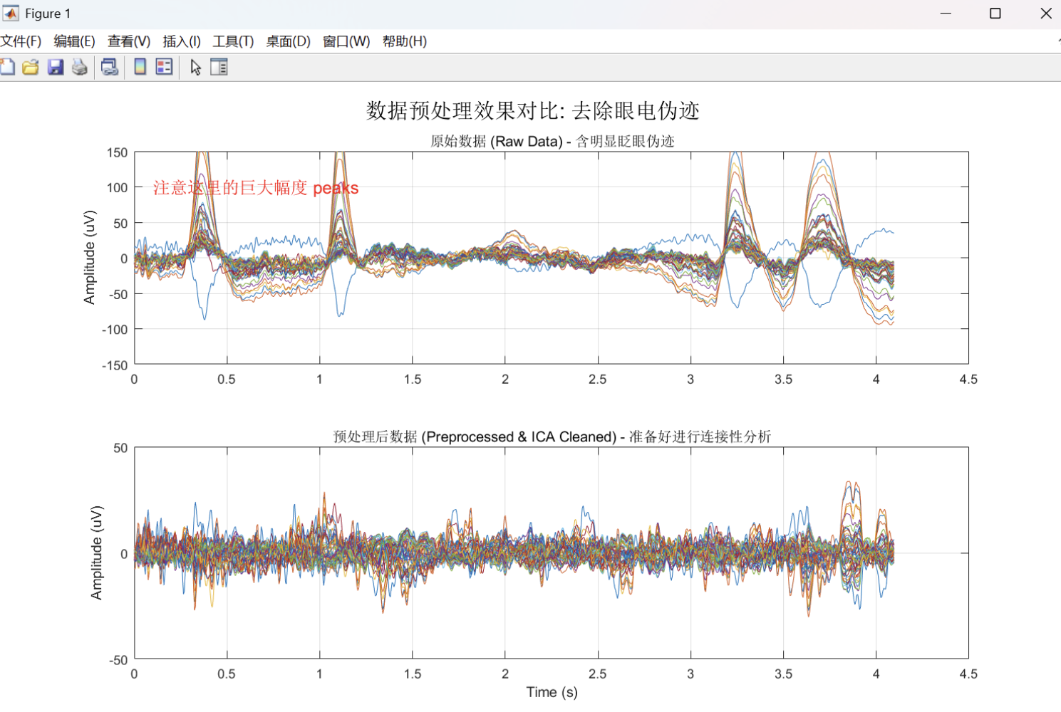 - 上图(原始数据): 我们可以清晰地看到在 0.4s, 1.1s, 3.2s 等时刻出现了巨大的尖峰,幅度高达 150 µV。这是典型的眨眼伪迹。如果不去除,这些强信号会瞬间传导至全脑电极(容积传导),导致算法误判为"全脑强连接"。