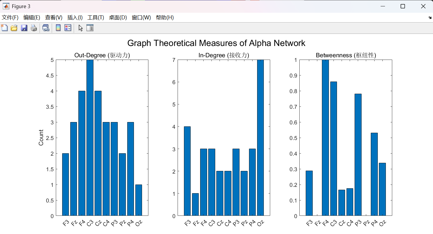 - Out-Degree (驱动力): C3 (左运动区)最高,F4 (右额叶)紧随其后。脑网络并非单一中心,而是多核心驱动。