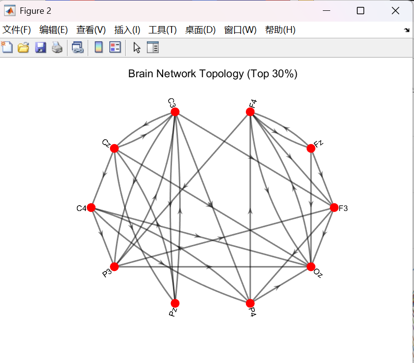 F4 -> C3是红色的(强驱动),但C3 -> F4颜色较浅。这证明了捕捉到了有向的信息流,而非简单的同步。 - 关键连接: 可以观察到右侧额叶 (F4) 和左侧中央区 (C3) 作为源 发出了大量强连接;而枕叶 (Oz) 作为目标 接收了大量输入(注意 Oz 所在行的深色区域较少,说明它很少驱动别人,但所在列颜色较深,说明它在被驱动)。