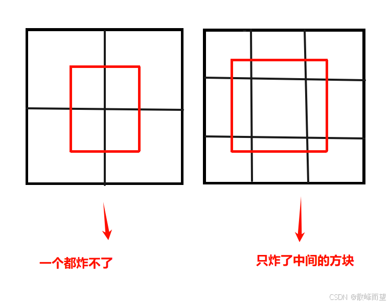 因为题目要求若目标位于爆破正方形的边上,该目标不会被摧毁,则以下这些情况炸弹威力会减弱