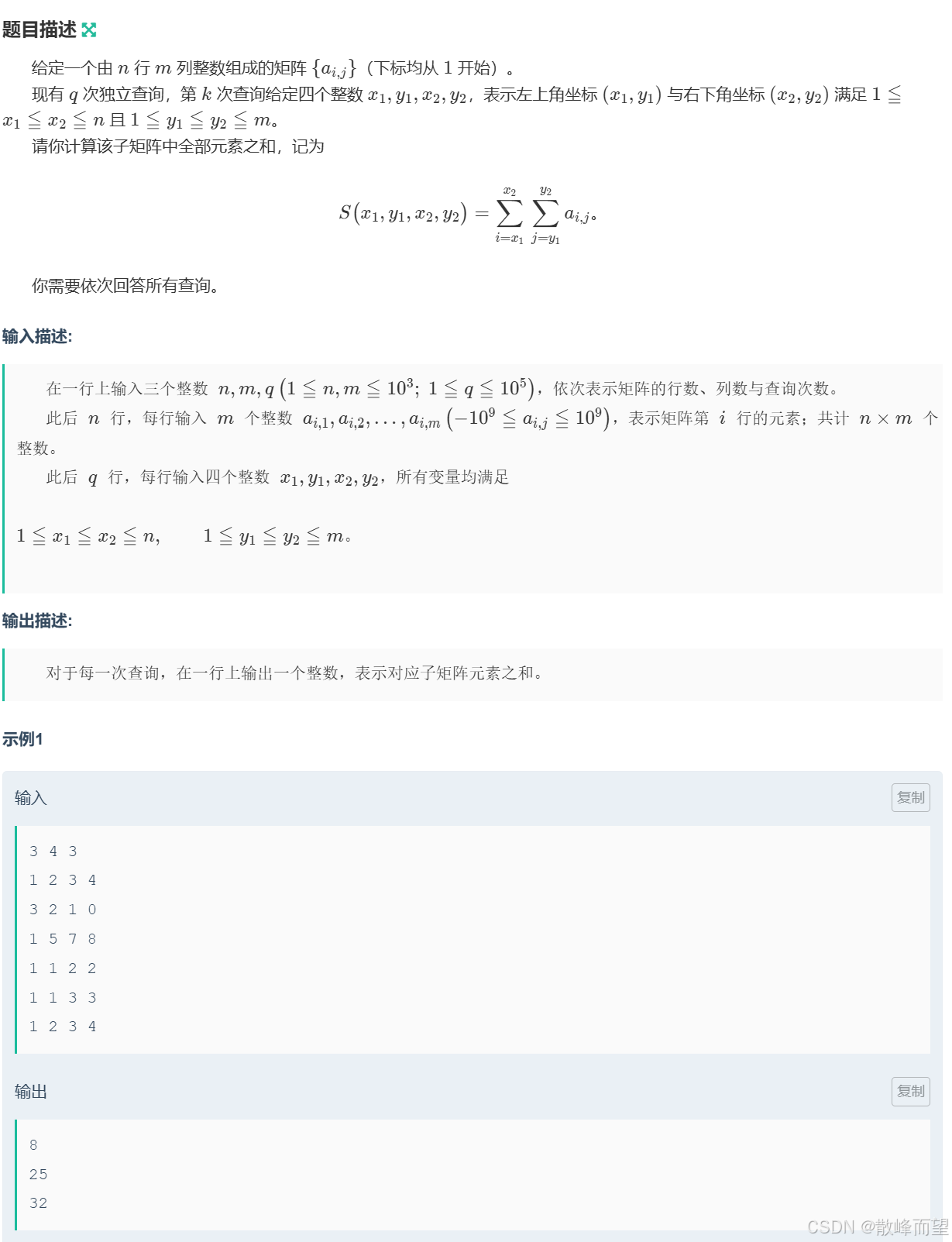 查询哪个子区间,用两层 for 循环,累加。时间复杂度高 O(q * n * m) - 二维前缀和