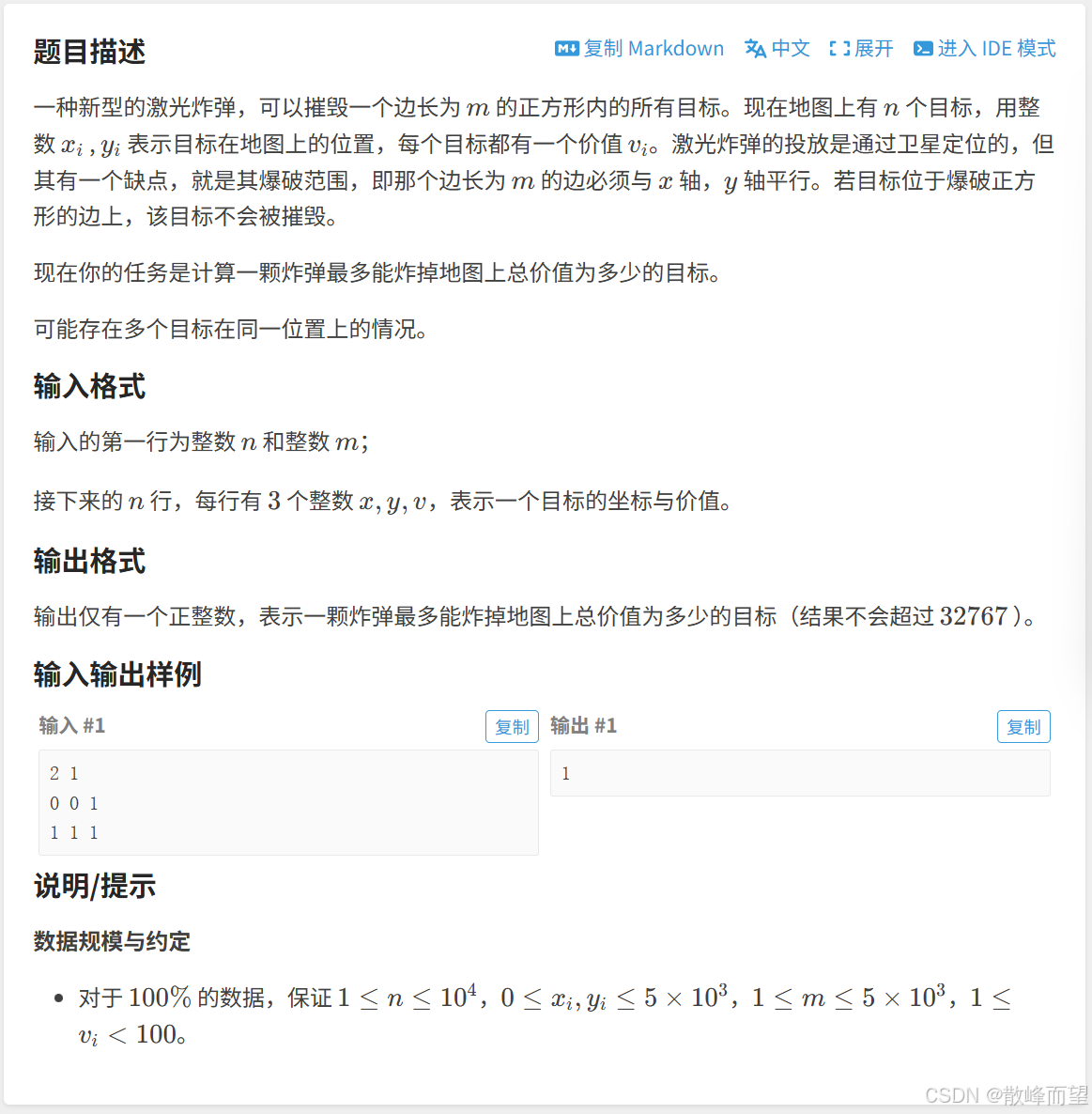枚举右下角 [x2, y2] 从而得到整个正方形,用一个二维矩阵将所有目标的价值存起来,其中 a[i][j] 就表示 [i, j] 位置的目标价值之和。