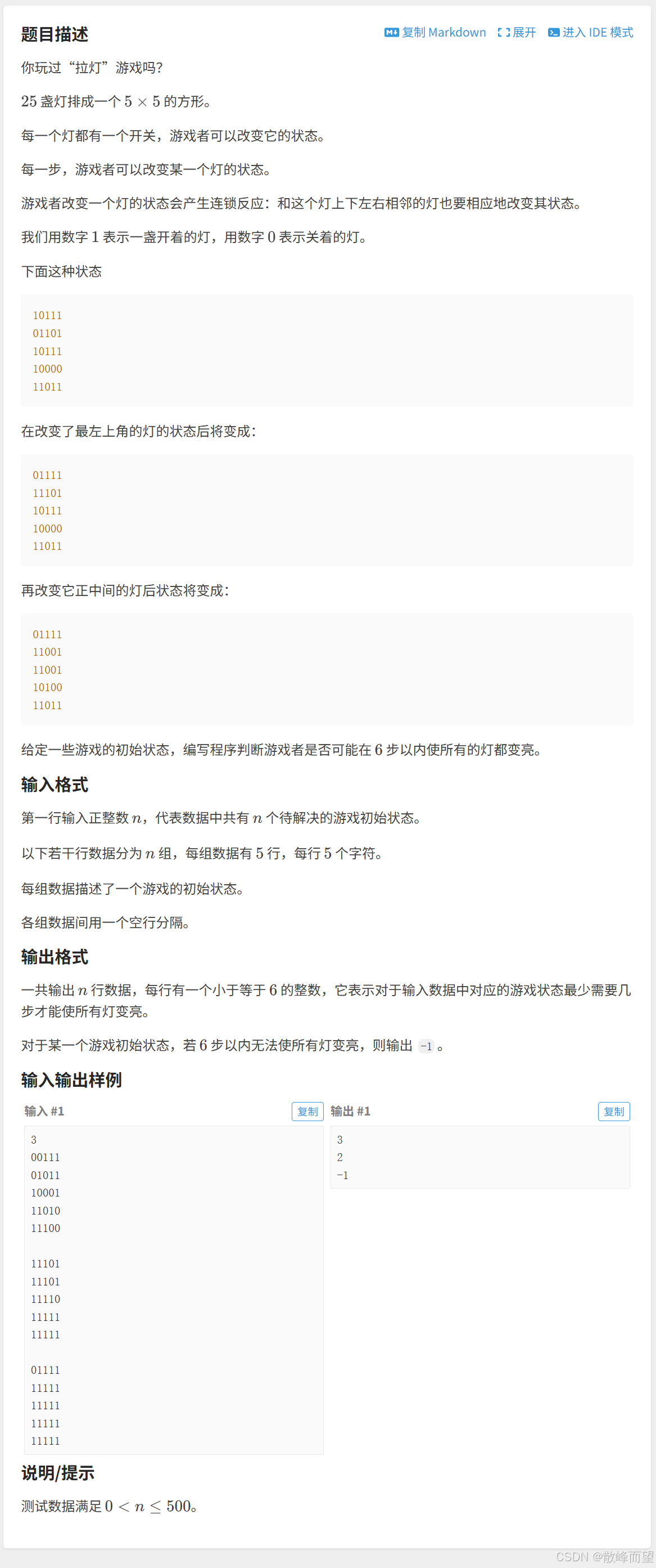 一层 for 循环,判断 a[i] 和最终状态相应的二进制。如果是0 -> 1则合法,并记录一下;如果是1 -> 0则不合法,返回 -1 。 - 当前行的最终状态 a[i] 确定之后,则合法推导下一行的最终状态 a[i + 1]