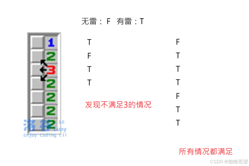 因此,我们枚举第一列中,第一行的两种状态:要么有雷,要么没雷。然后依次计算剩下行的值,看看是否能满足所给的数据。