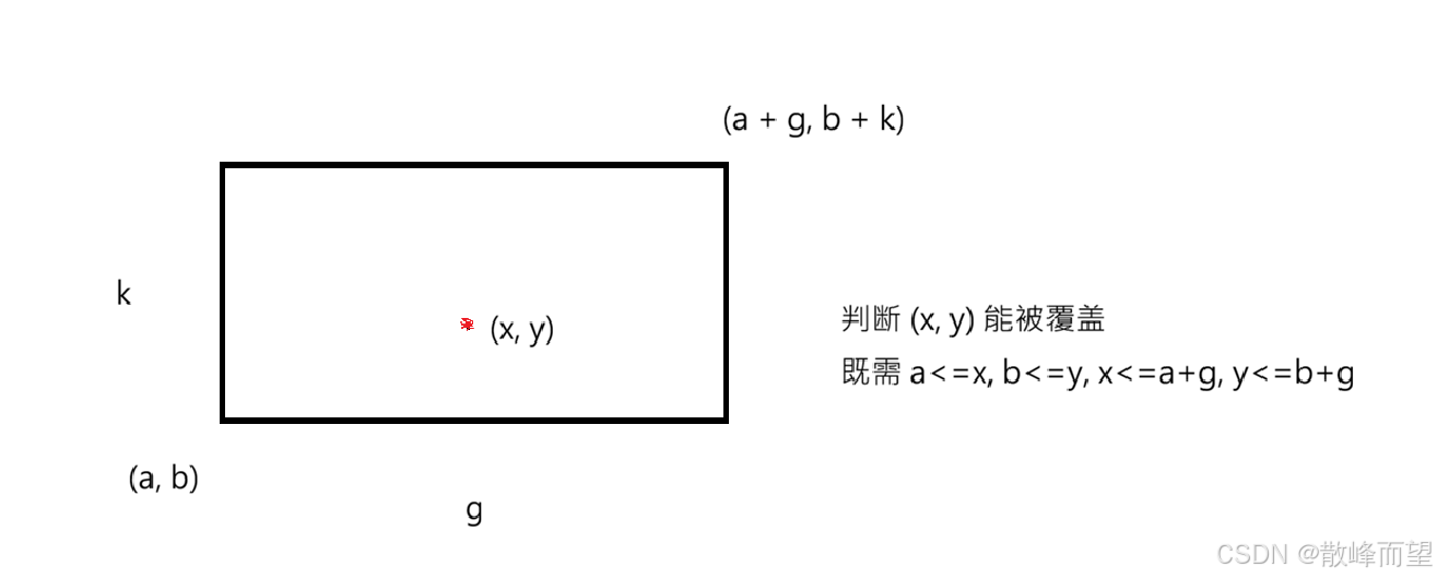 由题目要求四个整数 a,b,g,k 中,地毯的左下角的坐标 (a, b) 以及地毯在 x 轴和 y 轴方向的长度。根据题目给的示例一,我们可以锁定全部覆盖的点。