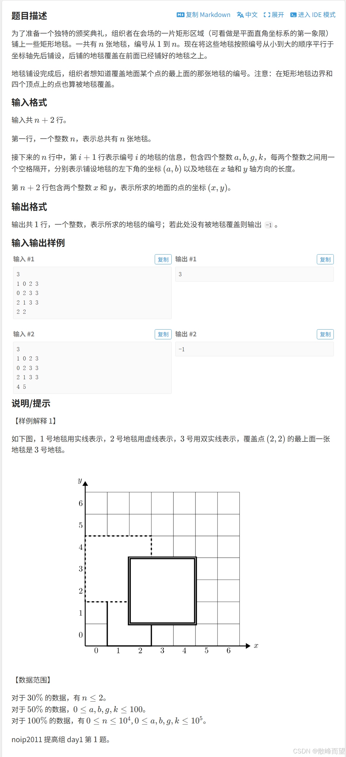 因为要输出的是覆盖地面某个点的最上面的那张地毯的编号,所以我们直接逆序遍历所有地毯,第一次覆盖该位置的的地毯便是我们所需要的结果。