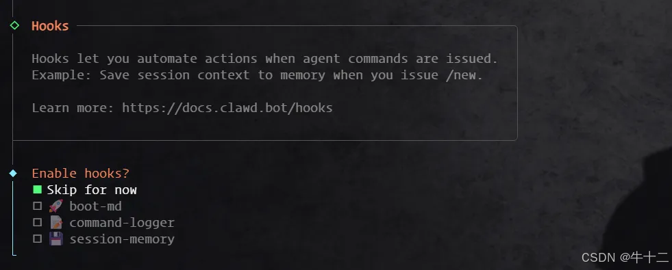 继续下面选择 hooks,也是使用空格选择 No,如下图