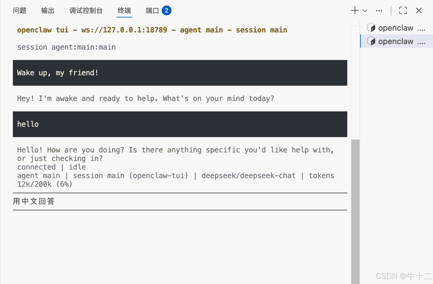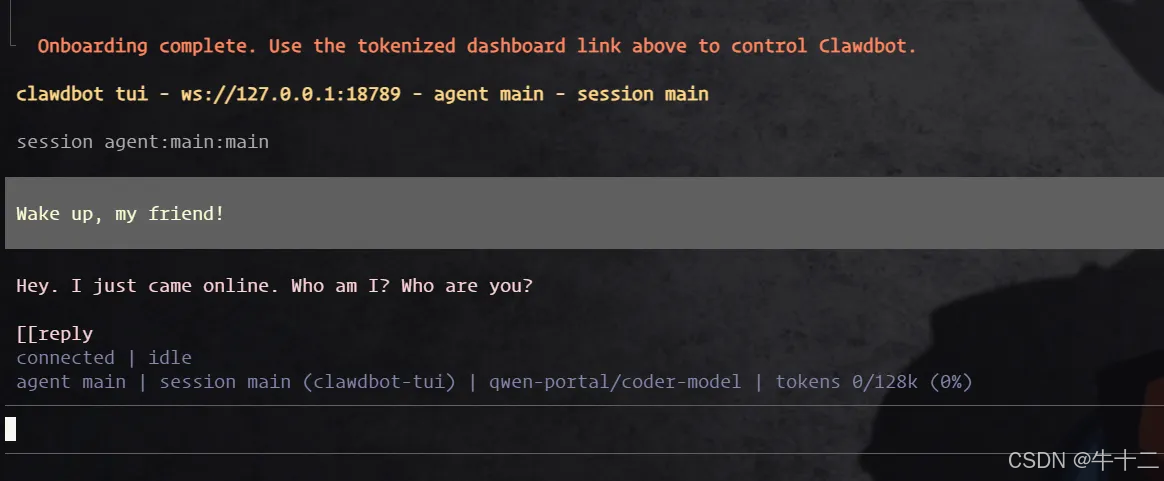 如果看到 TUI 聊天界面,说明安装成功,可以尝试输入 Hello 进行测试。