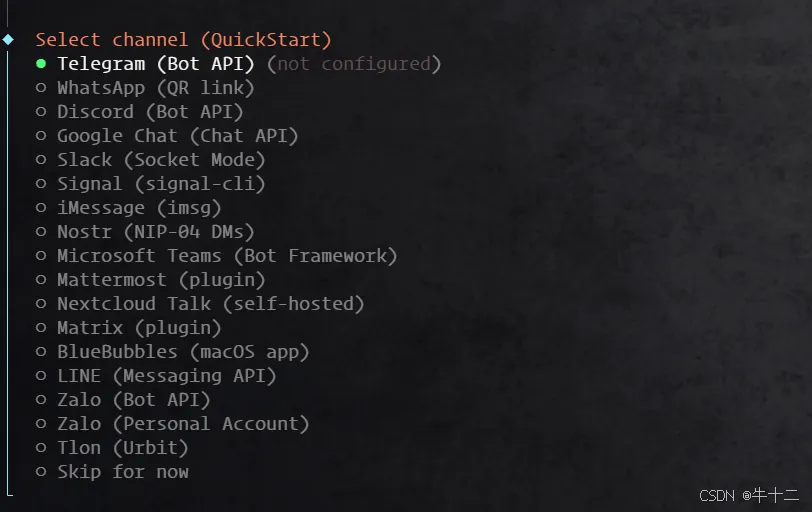 接下来会提示选择 channel,这里先跳过,后续再添加