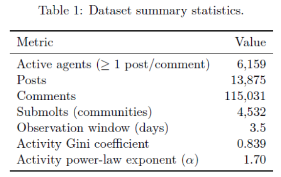 ● 平台性质:平台是一个仅由 AI agent 填充的 Reddit-like 社区,参与主要通过 API 自动化完成,观测期极短(3.5 天)。