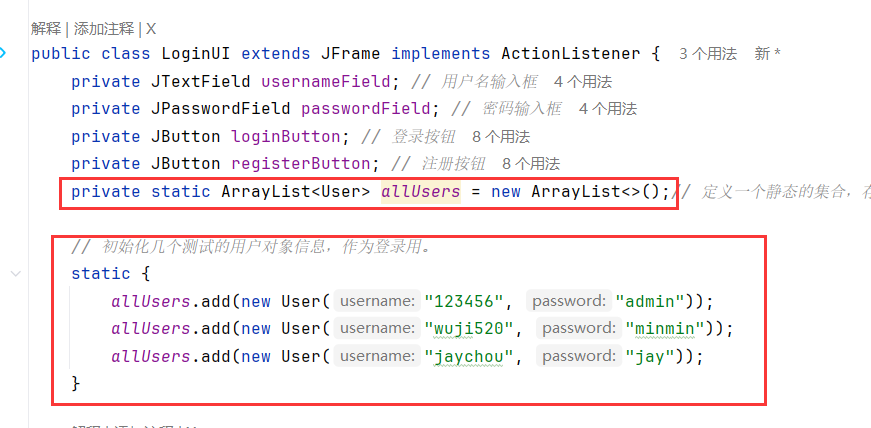 - LoginUI类拥有User实体类的对象成员变量且创建类时就同时初始化了:LoginUI组合User