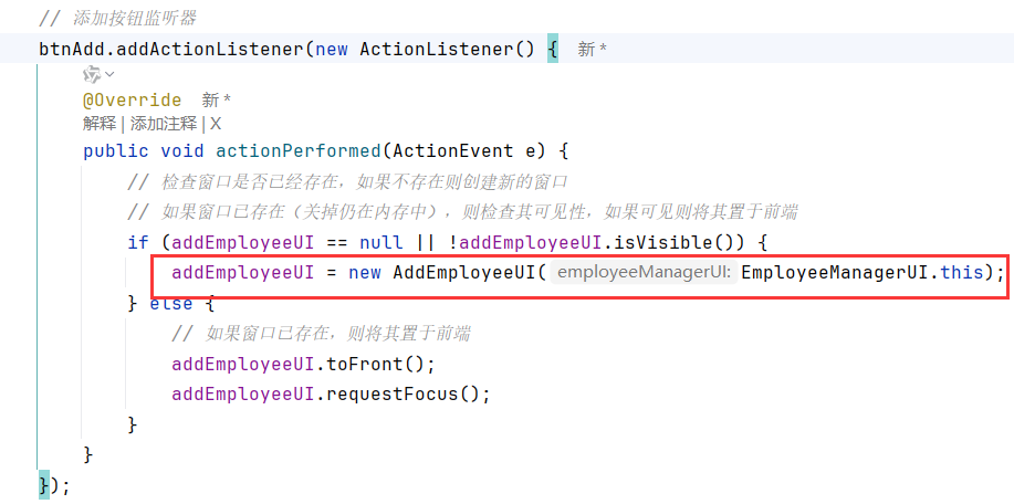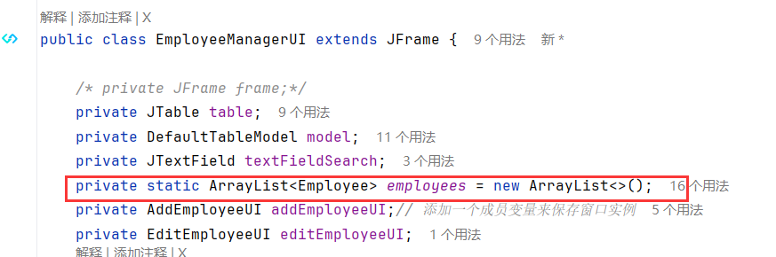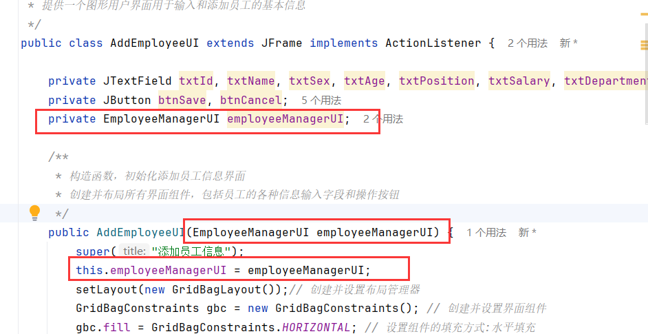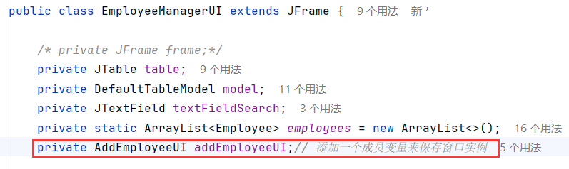- EmployeeManagerUI类的拥有AddEmployeeUI成员变量,并将自身引用传递过去:互相关联