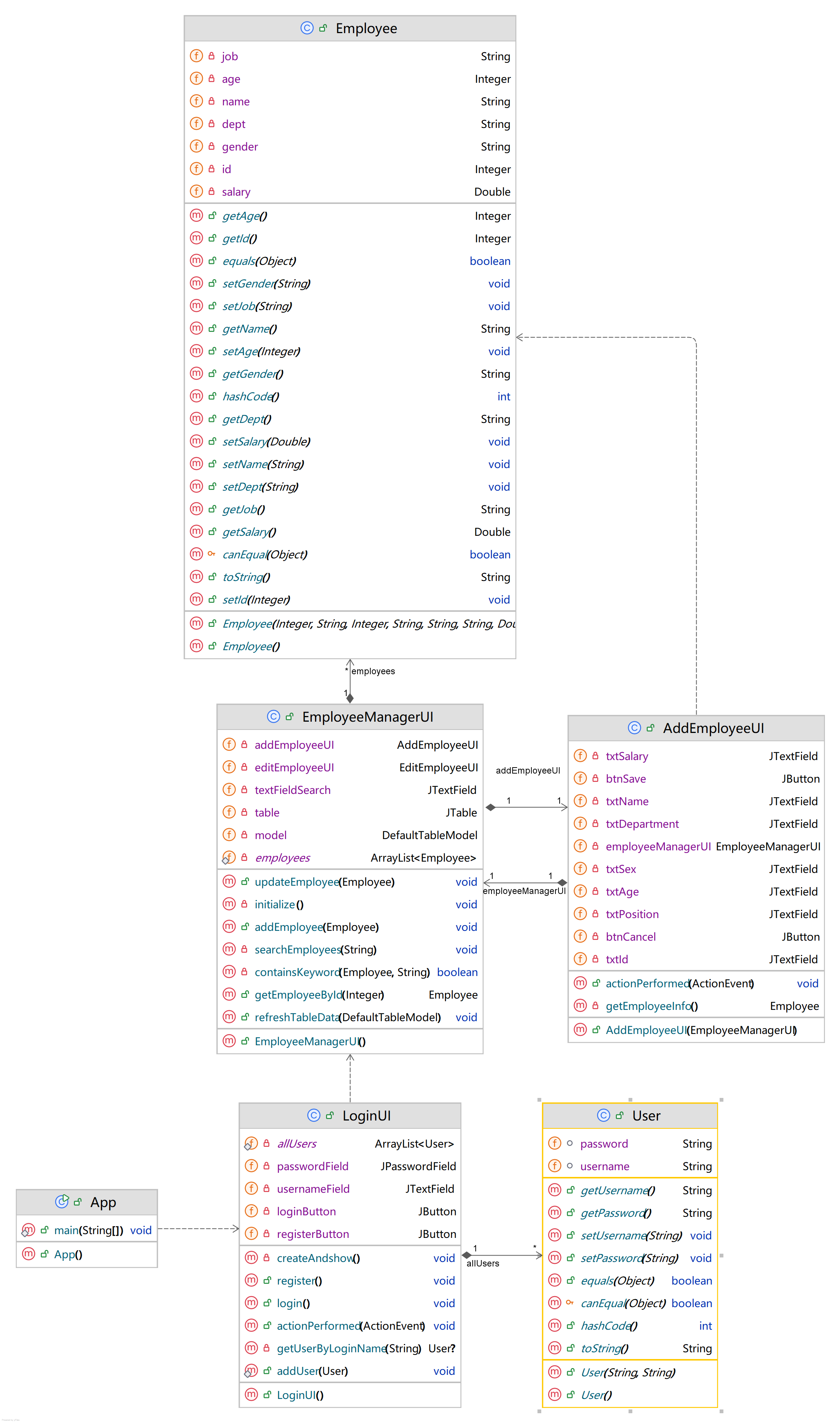 EditEmployee类同AddEmployee类,最终类图结果如下,使用了IDEA的UML导出功能