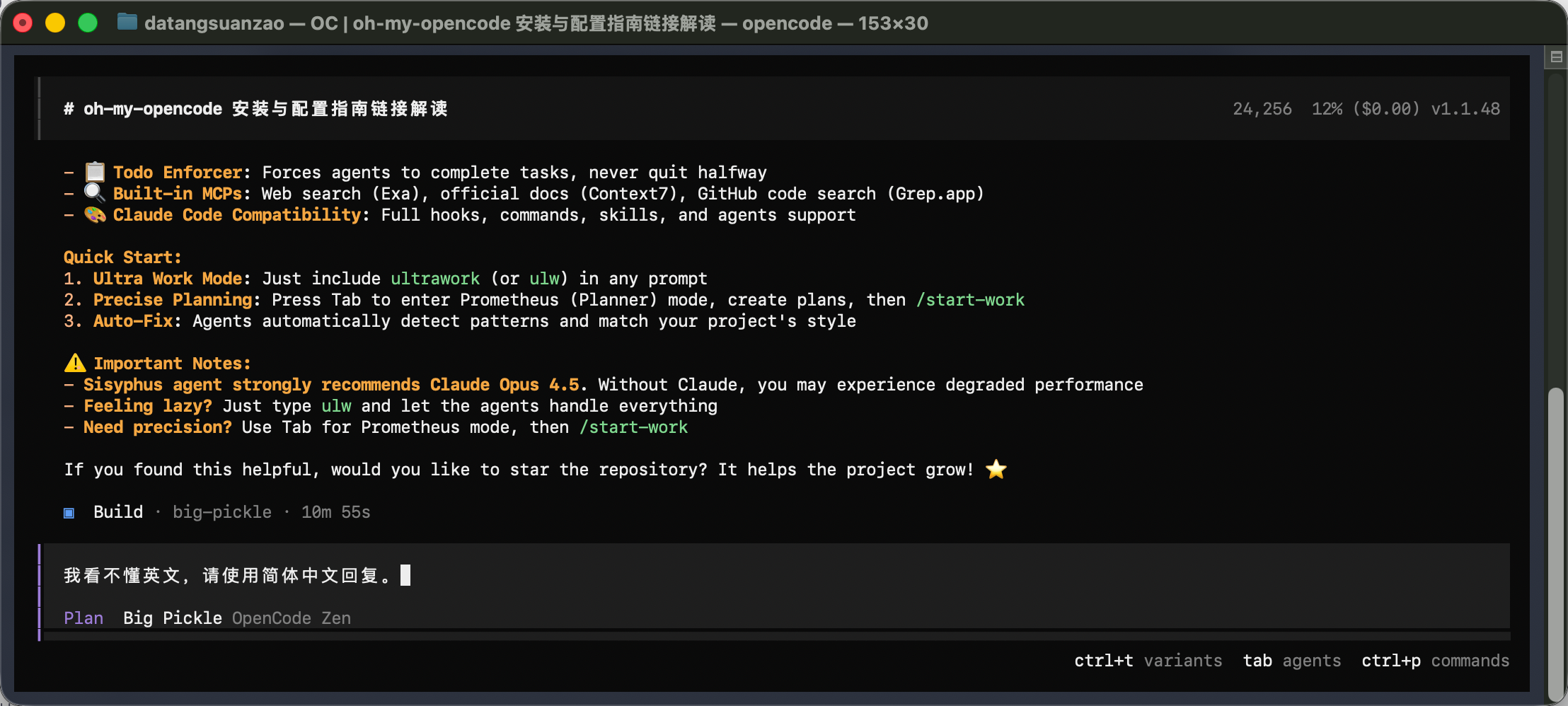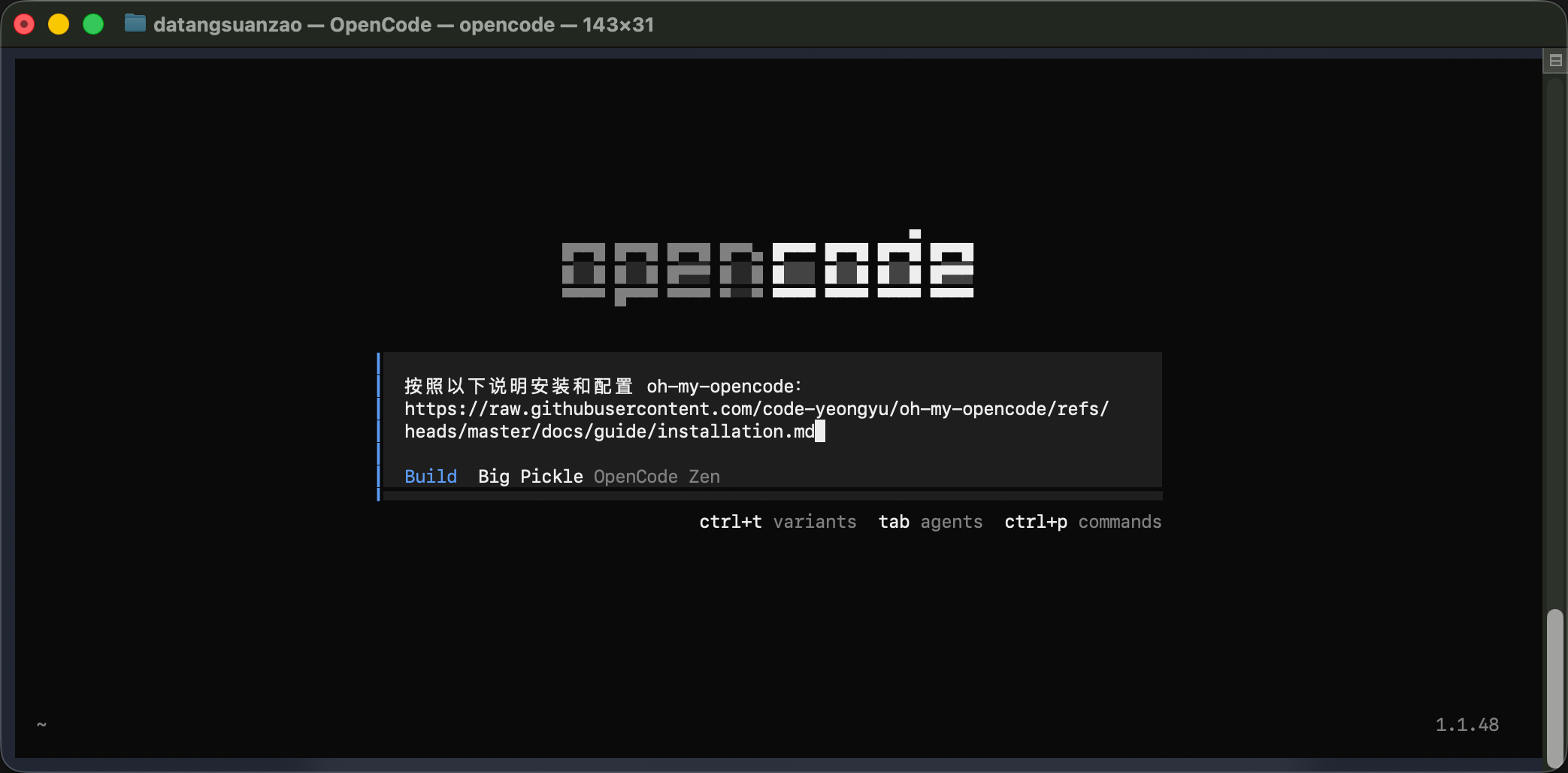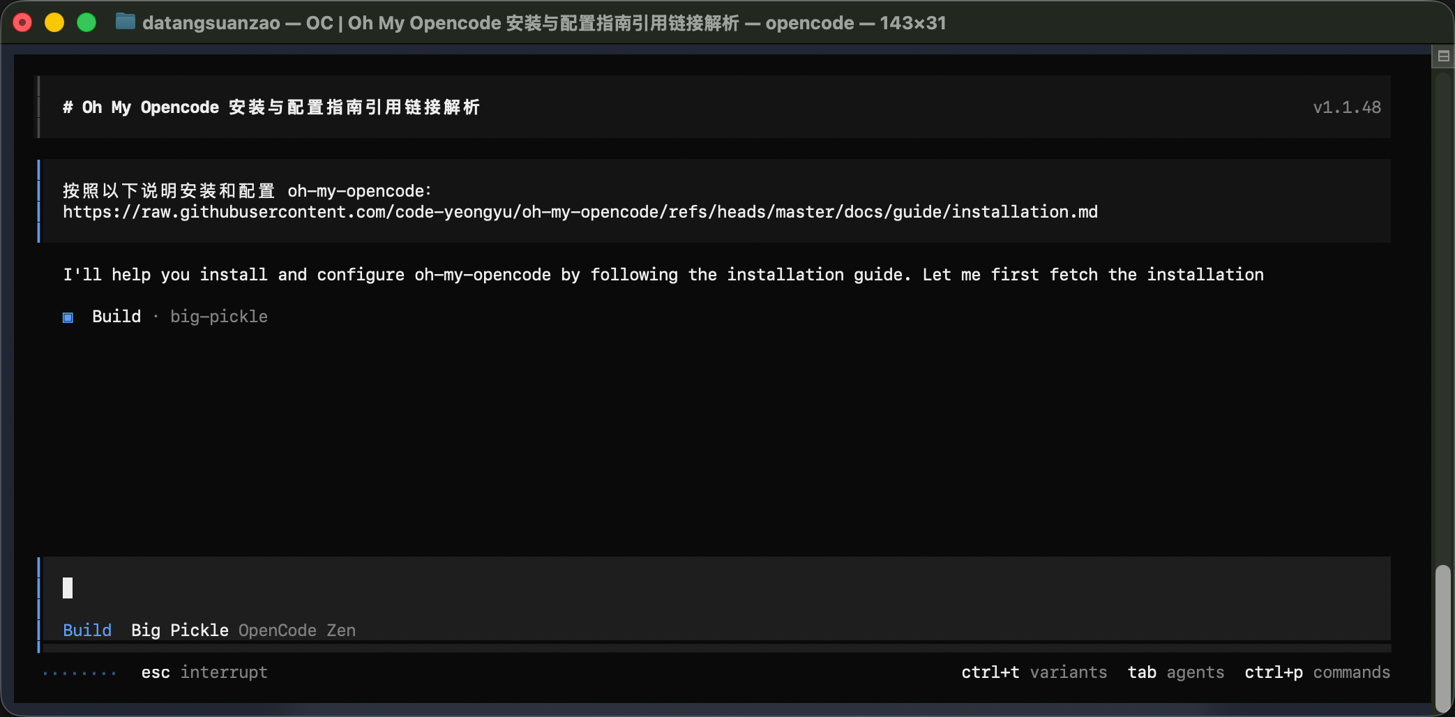 安装oh-my-opencode也特别简单,在OpenCode中,新起一个对话,输入以下提示词即可让 AI 自动安装 Oh My OpenCode :