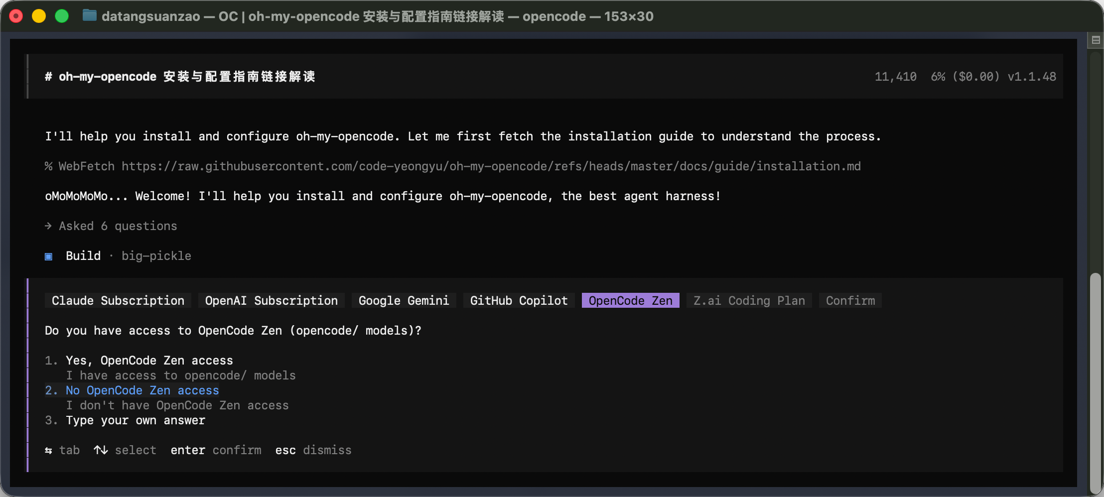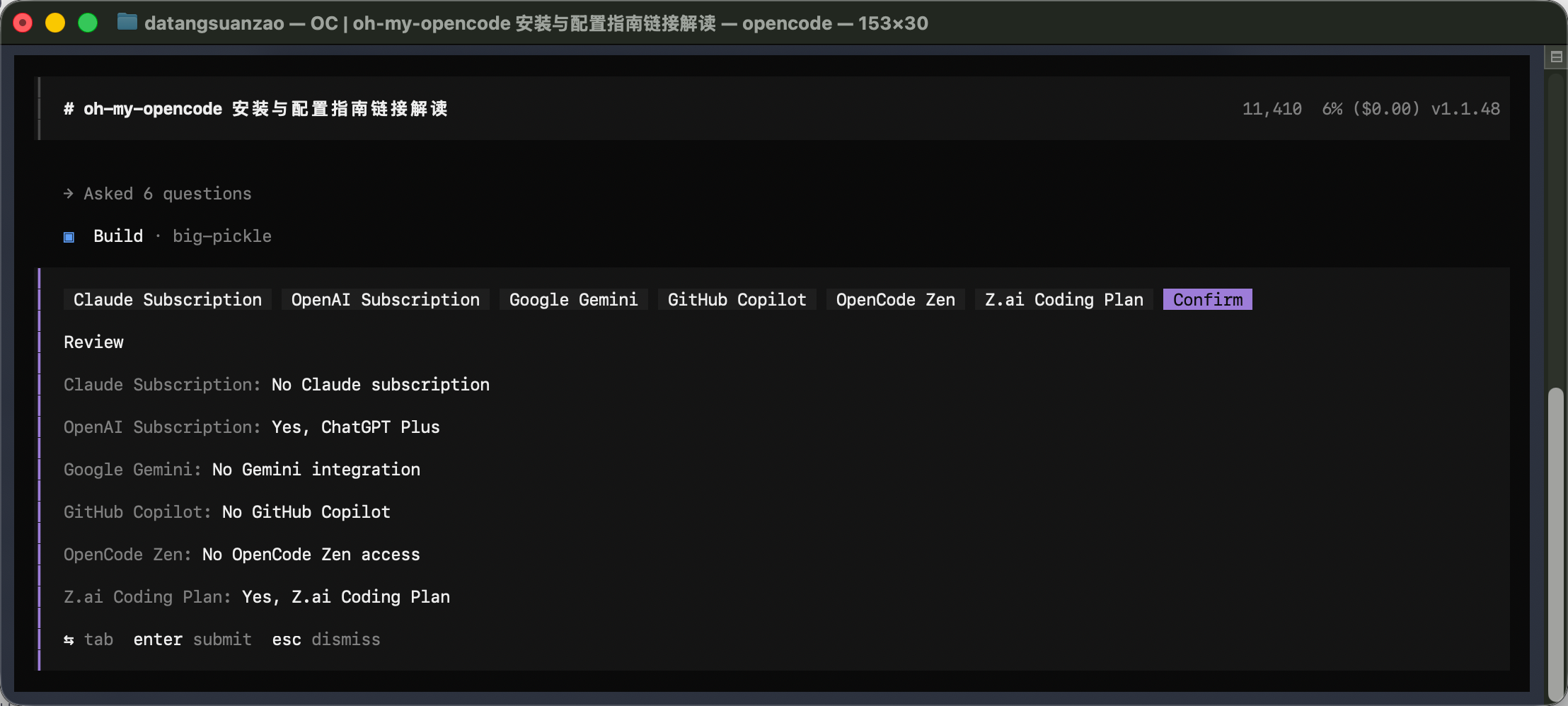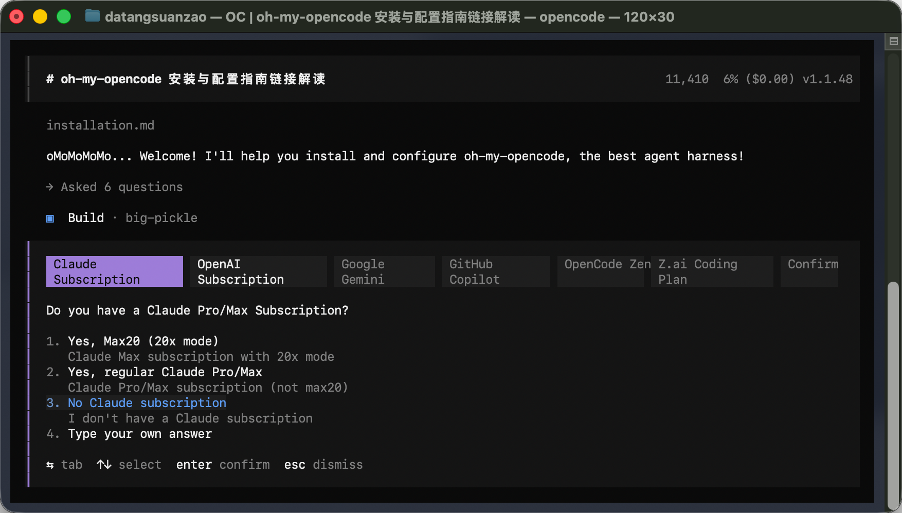 安装过程中会问我们有没有御三家(Claude、ChatGPT、Gemini)的大模型订阅,我们如实回答就行(最新版本变成选项,根据提示选择即可),没有就没有,有就是有(不是正经订阅,也要告诉人家,比如:没有Claude,但是我用的opencode-antigravity-auth,可以用Google上的Clude模型 等等)。