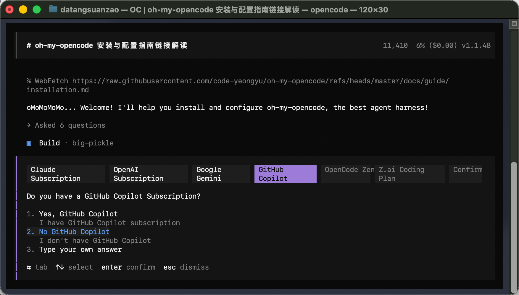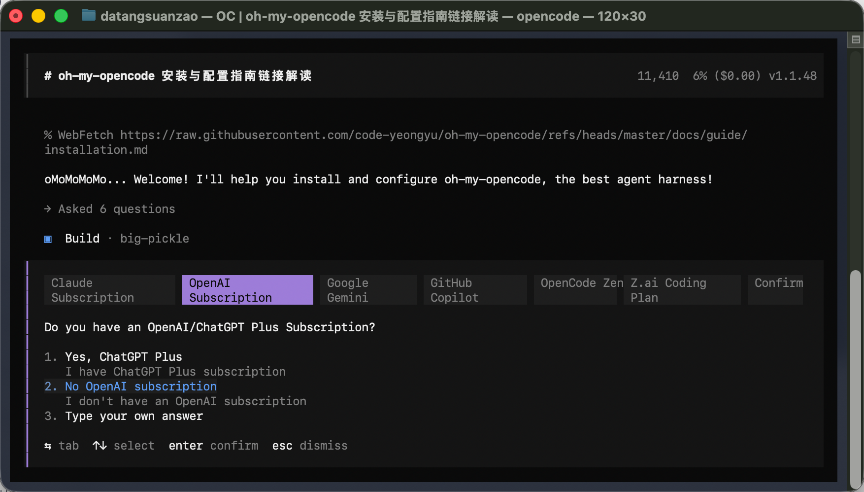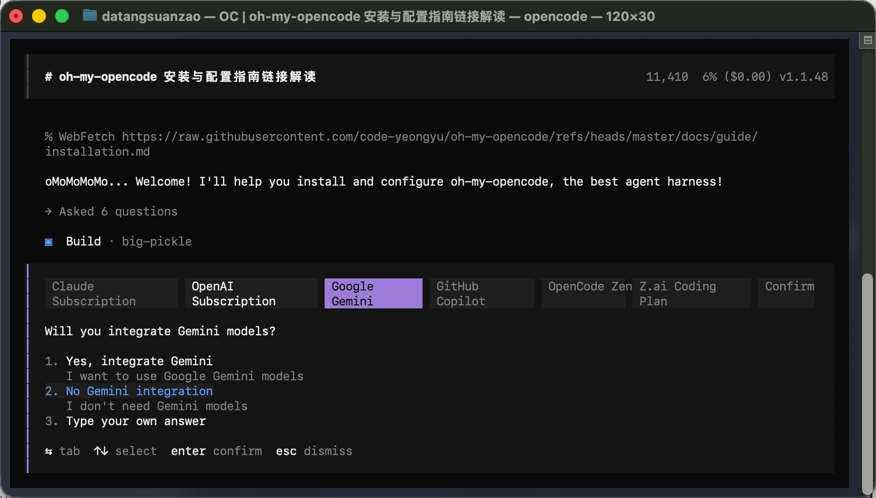 安装过程中会问我们有没有御三家(Claude、ChatGPT、Gemini)的大模型订阅,我们如实回答就行(最新版本变成选项,根据提示选择即可),没有就没有,有就是有(不是正经订阅,也要告诉人家,比如:没有Claude,但是我用的opencode-antigravity-auth,可以用Google上的Clude模型 等等)。