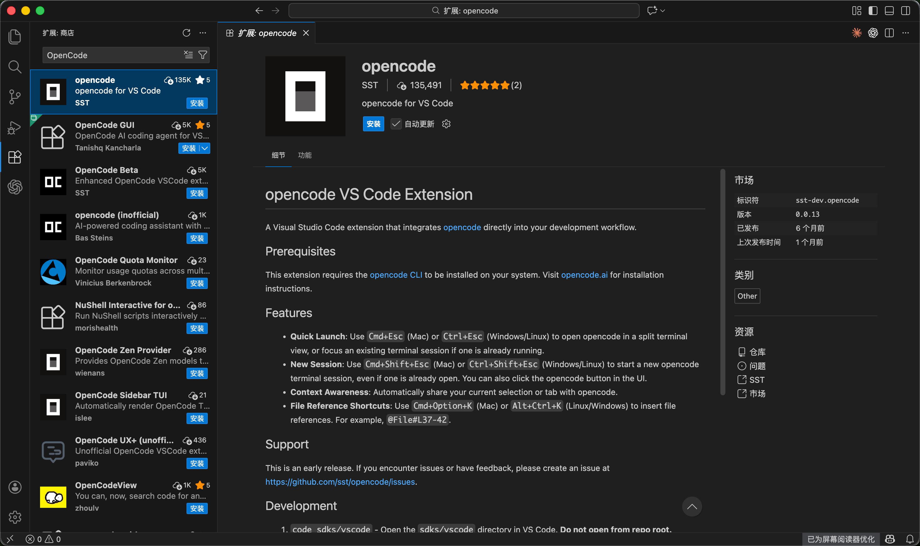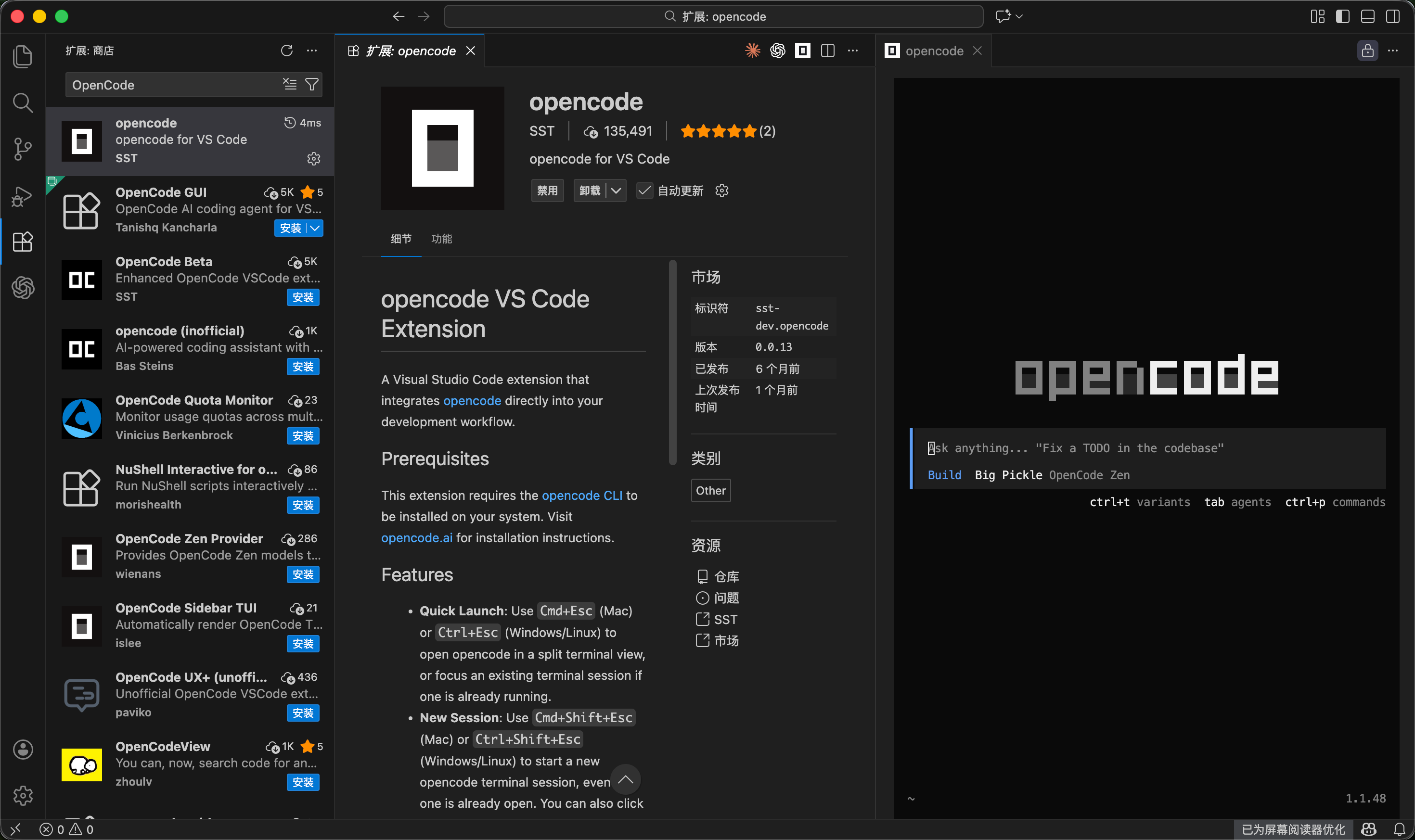 在 VS Code 中搜索 OpenCode ,找到 OpenCode" 插件并安装,安装完成后重启 VS Code 即可使用。