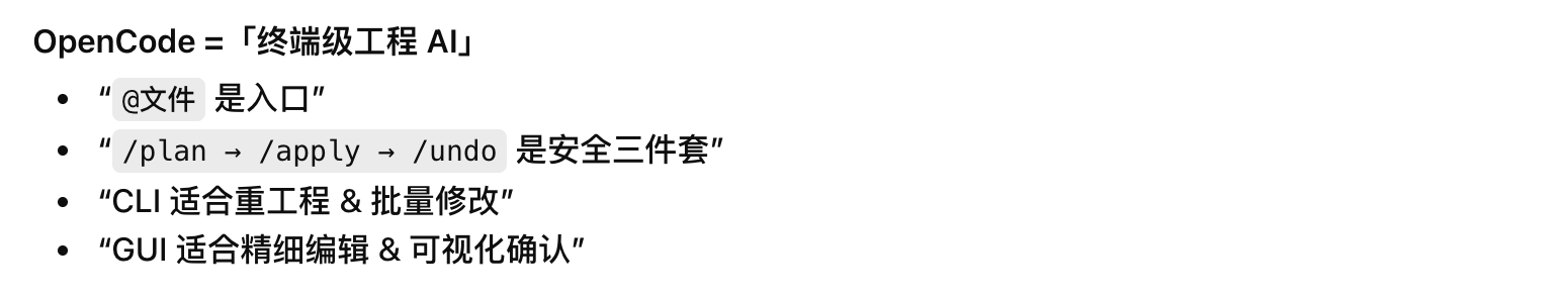 • 客户端/服务器架构:支持远程控制,甚至可以用手机驱动电脑上的 OpenCode。