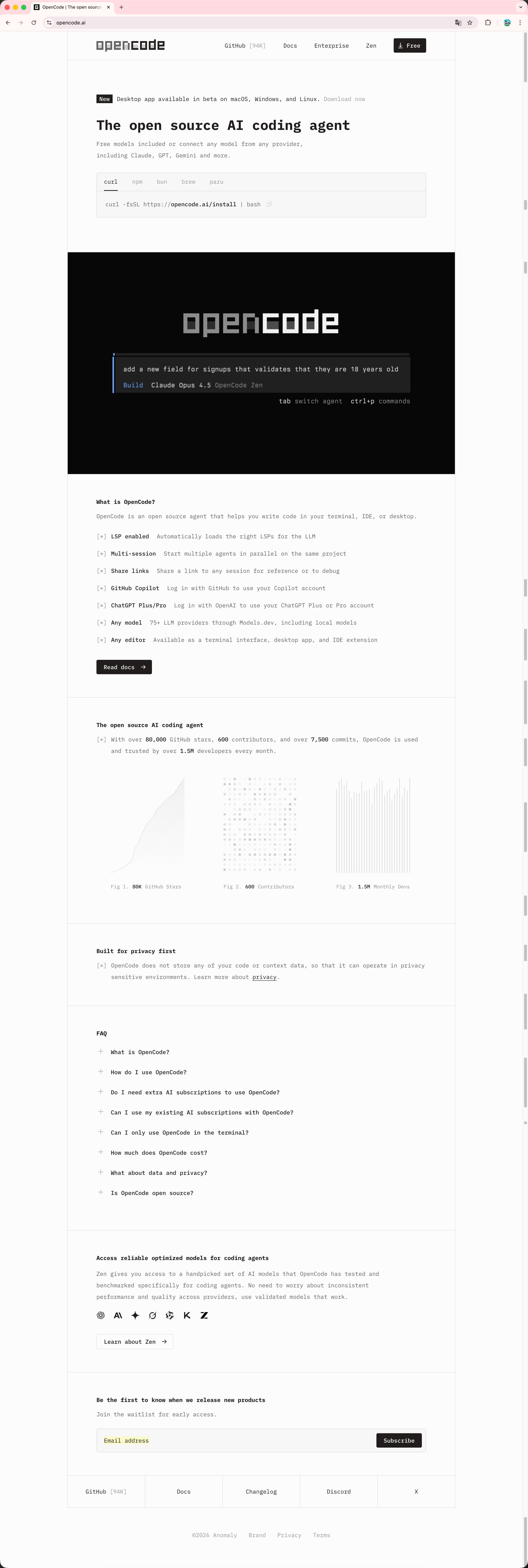 OpenCode 是一款开源、免费的 AI 编程助手工具(不包含服务端大模型),支持在终端(TUI)、桌面应用和 IDE 中使用,可替代 Claude Code、Cursor 等商业工具客户端。OpenCode 是一款开源的 AI 编程智能体,它能在终端、桌面应用或主流 IDE 中帮助你理解代码库、编写功能、重构代码和修复 Bug,从而大幅提升开发效率 1。截至目前(2026年02月01号),它拥有超过 80,000 个 GitHub 星标和每月超过 150 万开发者使用,是目前最受欢迎的开源 AI 编程工具之一。