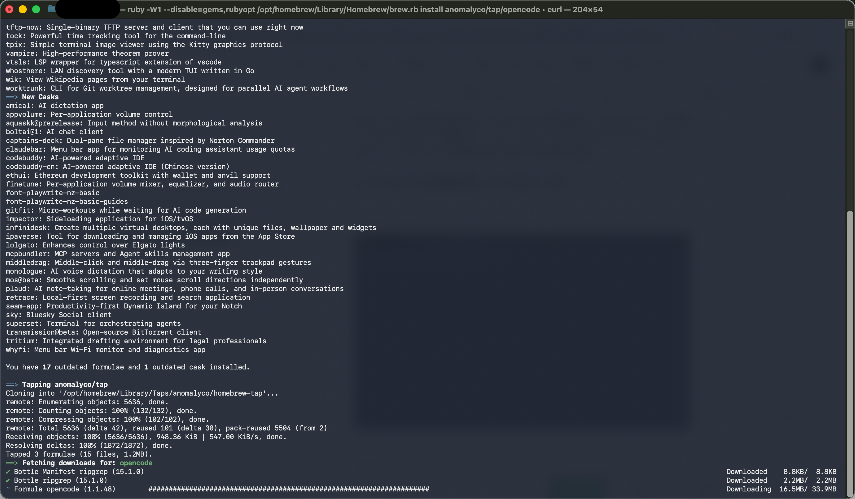 本文以 Mac 系统安装为例,OpenCode 终端使用 HomeBrew 方式安装(也可以选择一键脚本:curl -fsSL https://opencode.ai/install | bash),OpenCode 桌面版下载 M芯片的安装包安装。