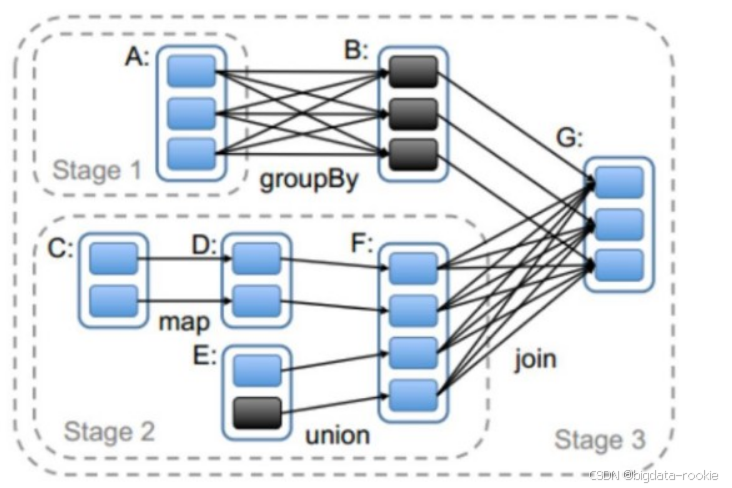 Spark 丰富了任务类型,有些任务之间数据流转不需要通过 shuffle,但是有些任务之间还是需要通过 shuffle 来传递数据,比如宽依赖的 group by key 以及各种 by key 算子。宽依赖之间会划分 stage ,stage 之间就会 shuffle,如下图中的 stage 1 和 stage 3 都发生了 shuffle。